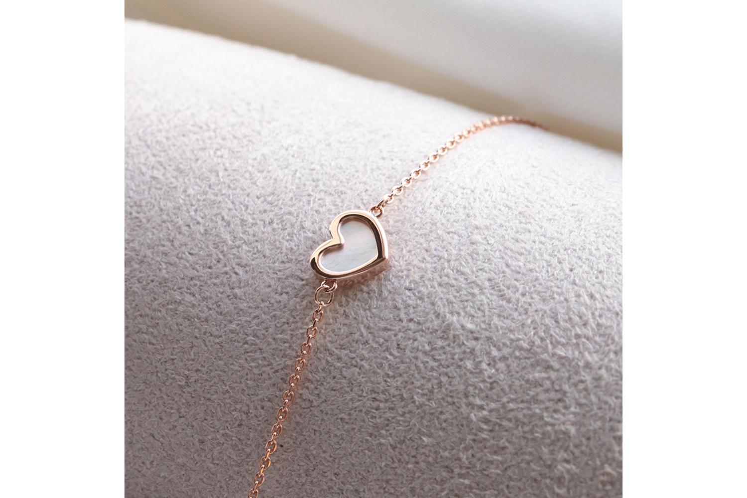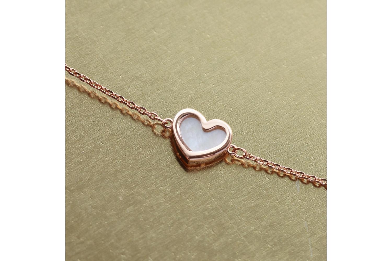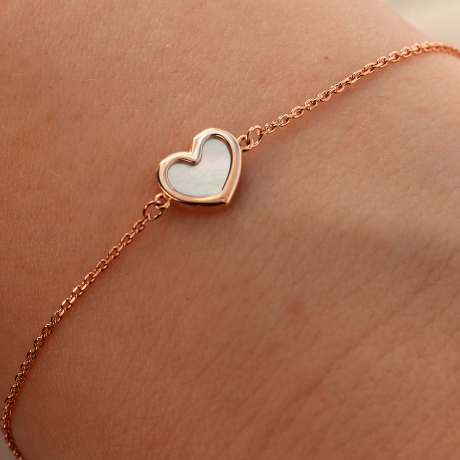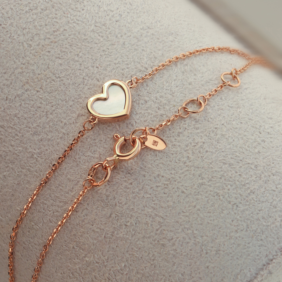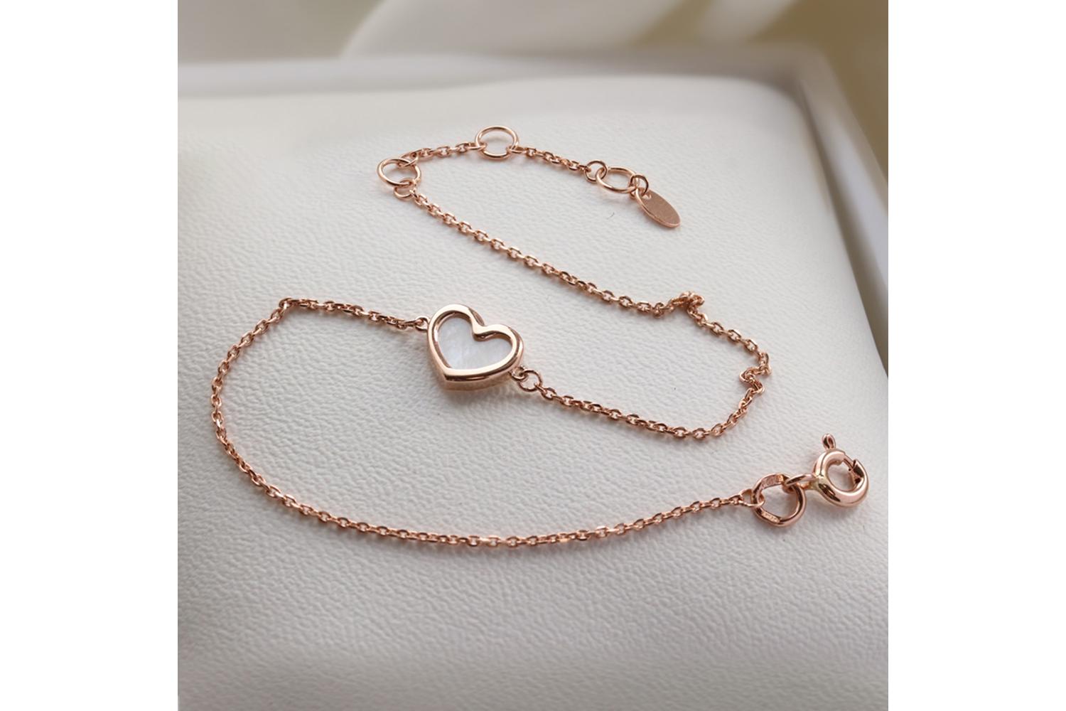 Изящный браслет-цепочка из красного золота - воплощение нежности и элегантности. Центральный элемент - миниатюрное сердце с перламутровой вставкой, которое привносит в украшение романтичный акцент.