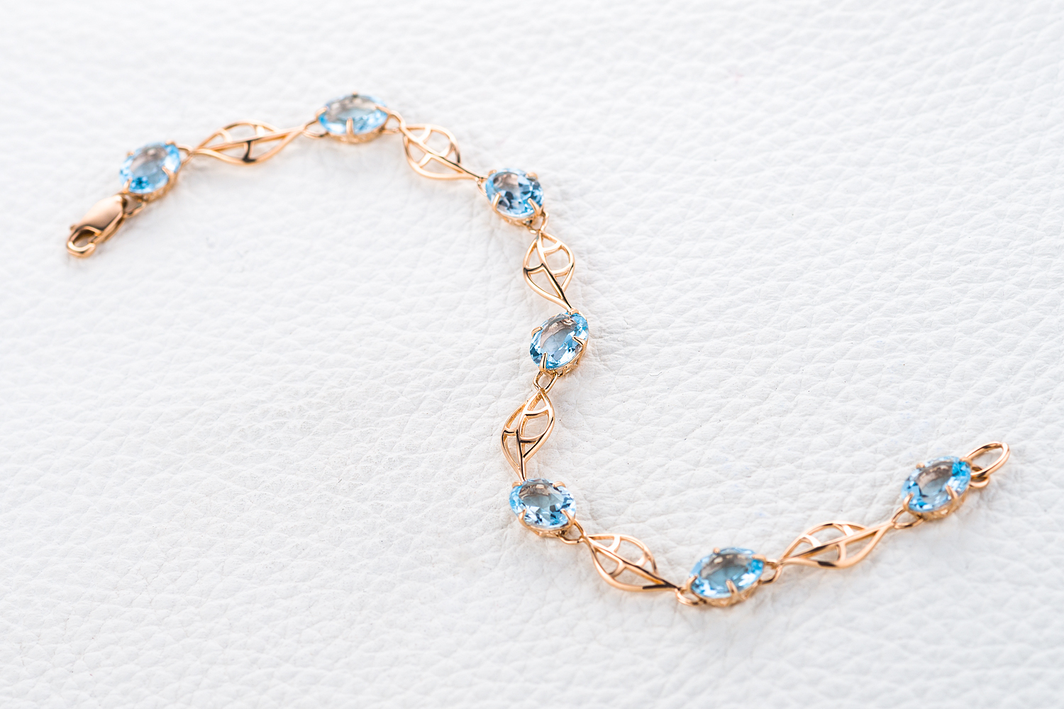 Изделие смотрится невероятно изящно - как тонкое кружево из золота и драгоценных камней. Цветовая гамма - красное золото и прозрачно-голубые топазы - создает ощущение весенней свежести и романтичности. Браслет идеально подчеркнет женственность и наполнит каждый день красотой.