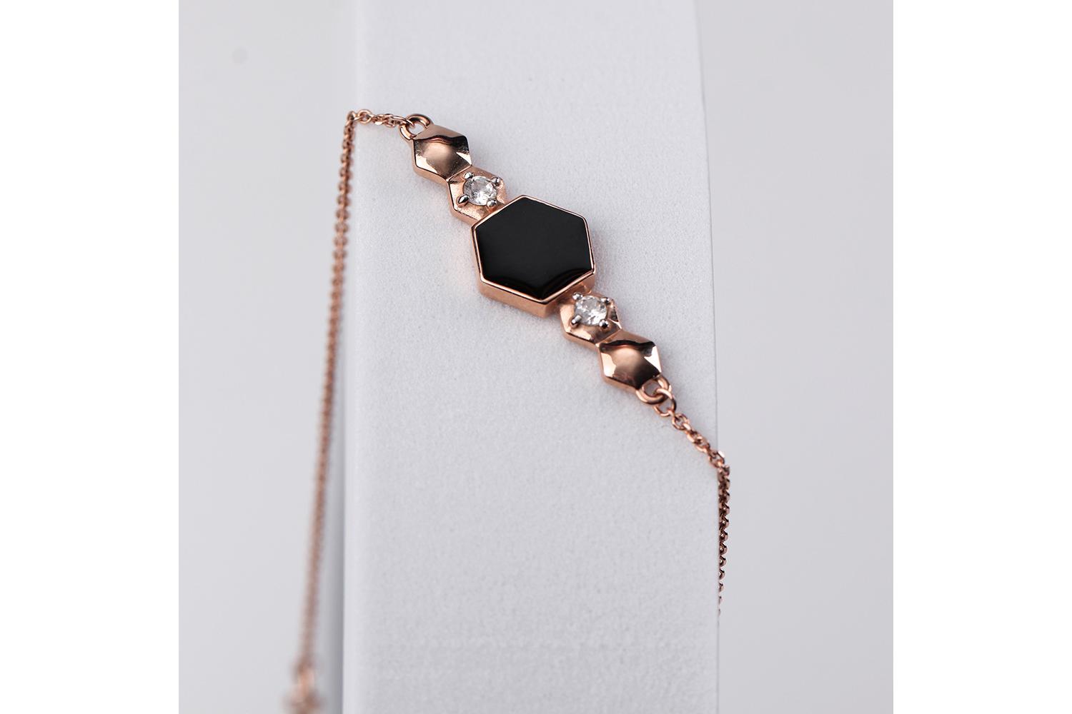 Мастера компании NEWGOLD, приложив всё свое мастерство и искусство, создали для Вас на нашем собственном производстве Браслет с шестиугольником из красного золота с 2 фианитами.