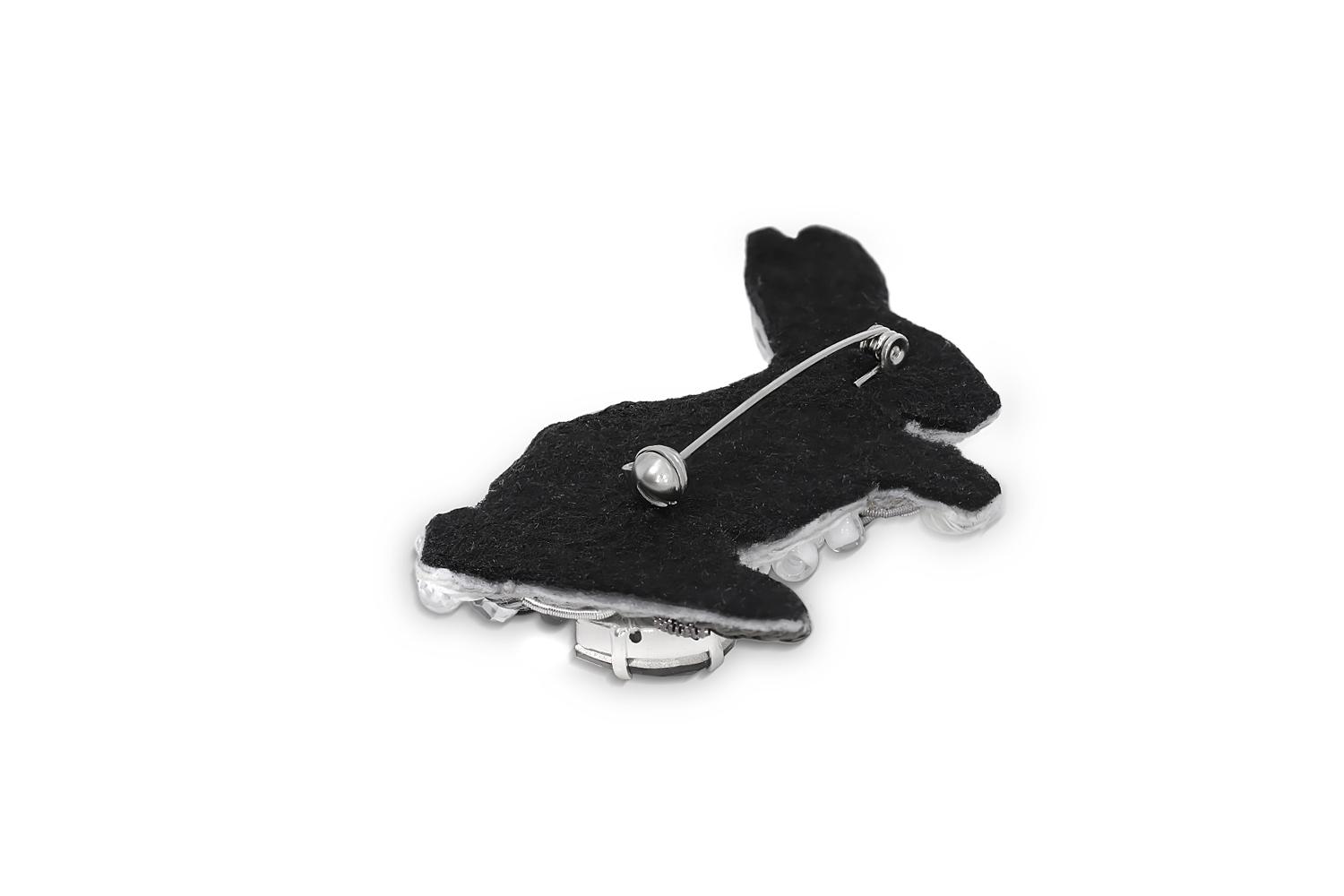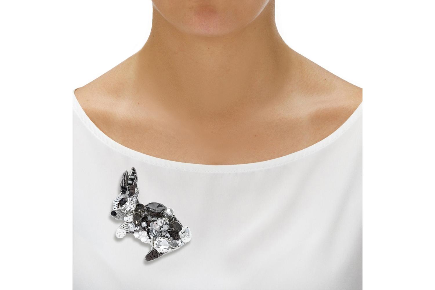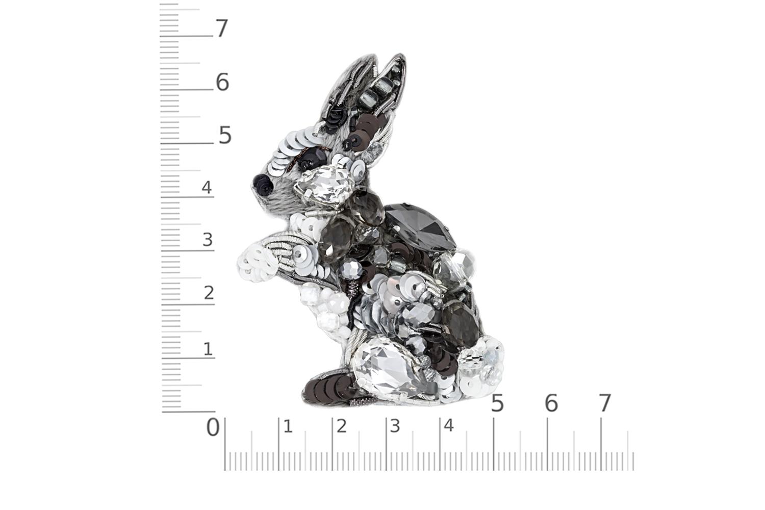 Изысканная брошь в форме зайца - истинное торжество ювелирного искусства! Многослойная композиция создана из сверкающих страз, металлических пайеток и крупных граненых кристаллов, которые имитируют мягкий мех и объемную структуру животного.
