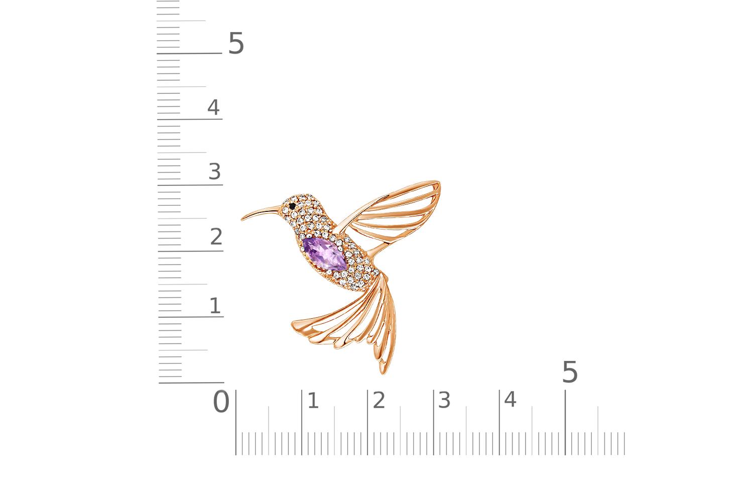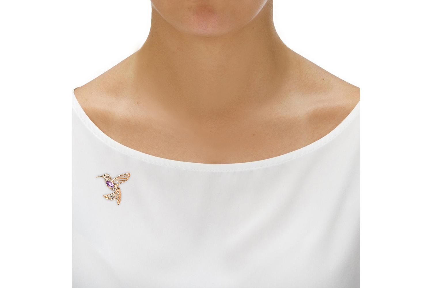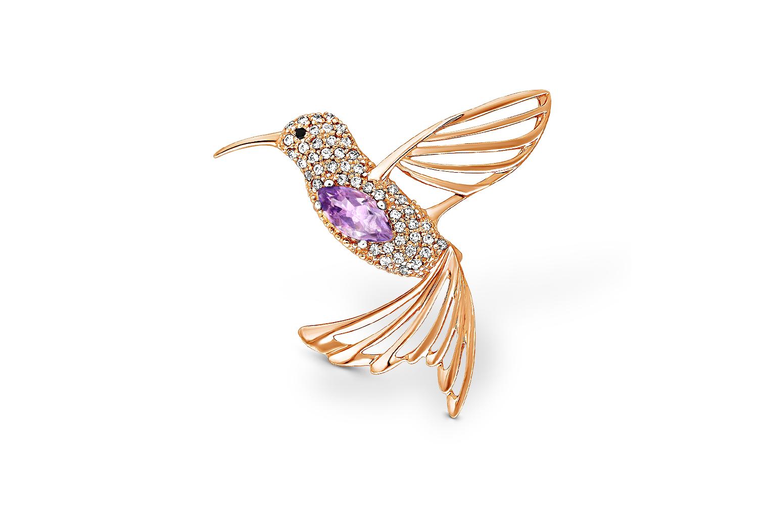 Мастера компании NEWGOLD, приложив всё свое мастерство и искусство, создали для Вас на нашем собственном производстве Брошь Колибри из красного золота с аметистом и 48 фианитами.