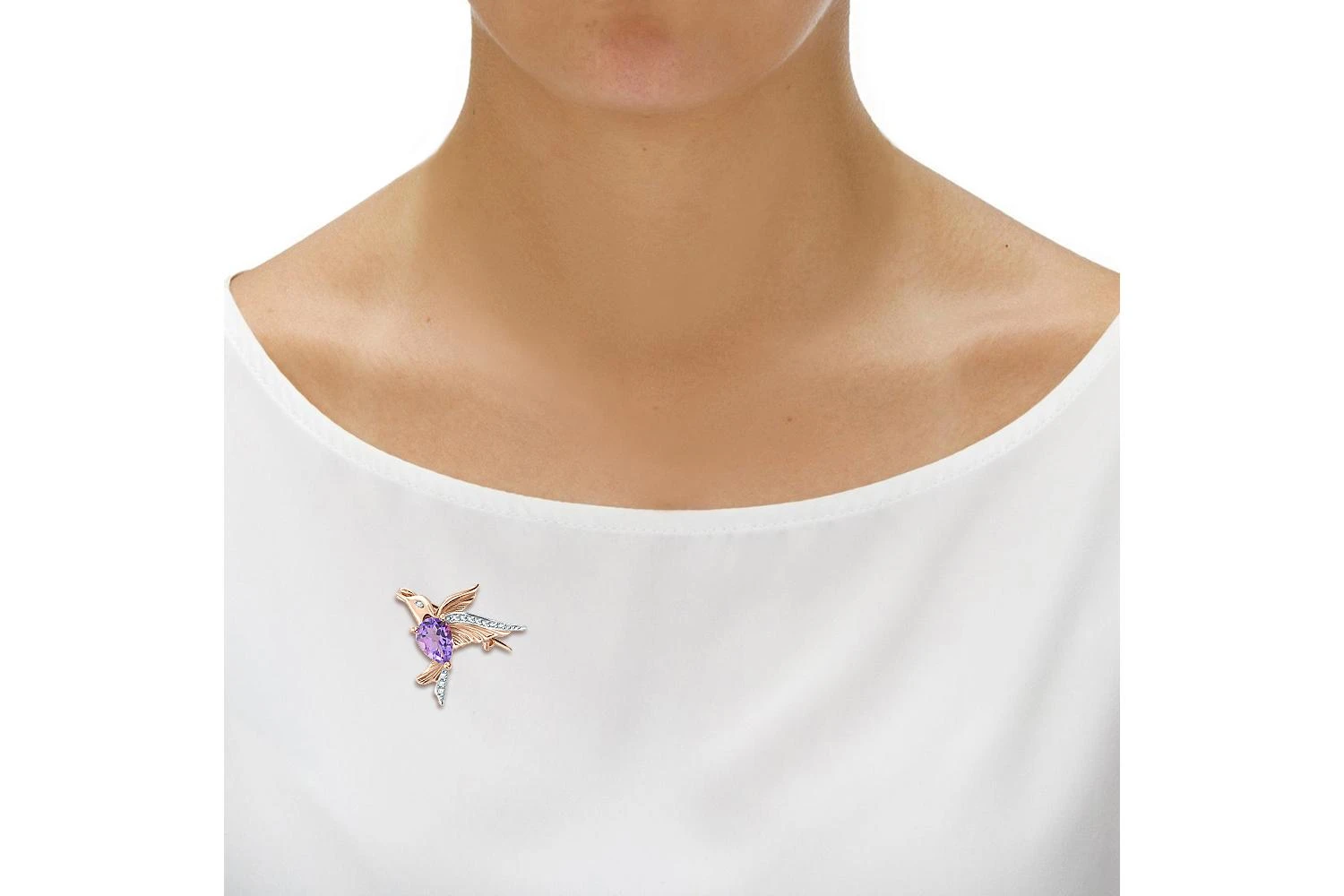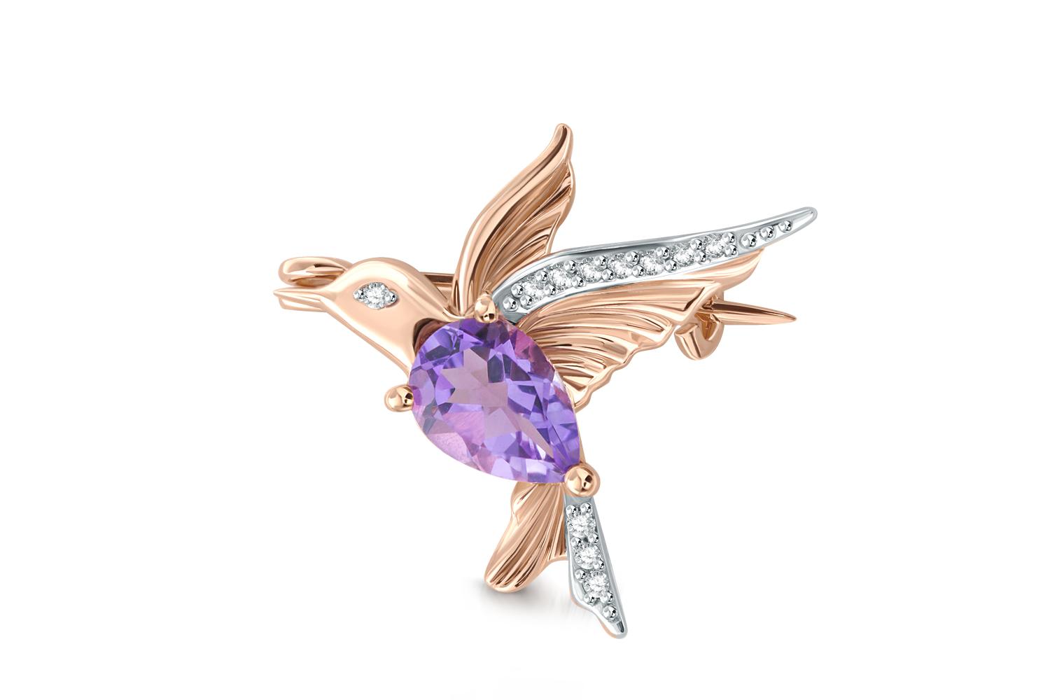 Закажите Брошь Колибри из красного золота с аметистом и 11 фианитами с получением в Москве через курьерскую службу доставки напрямую с нашего производственного склада завода NEWGOLD!