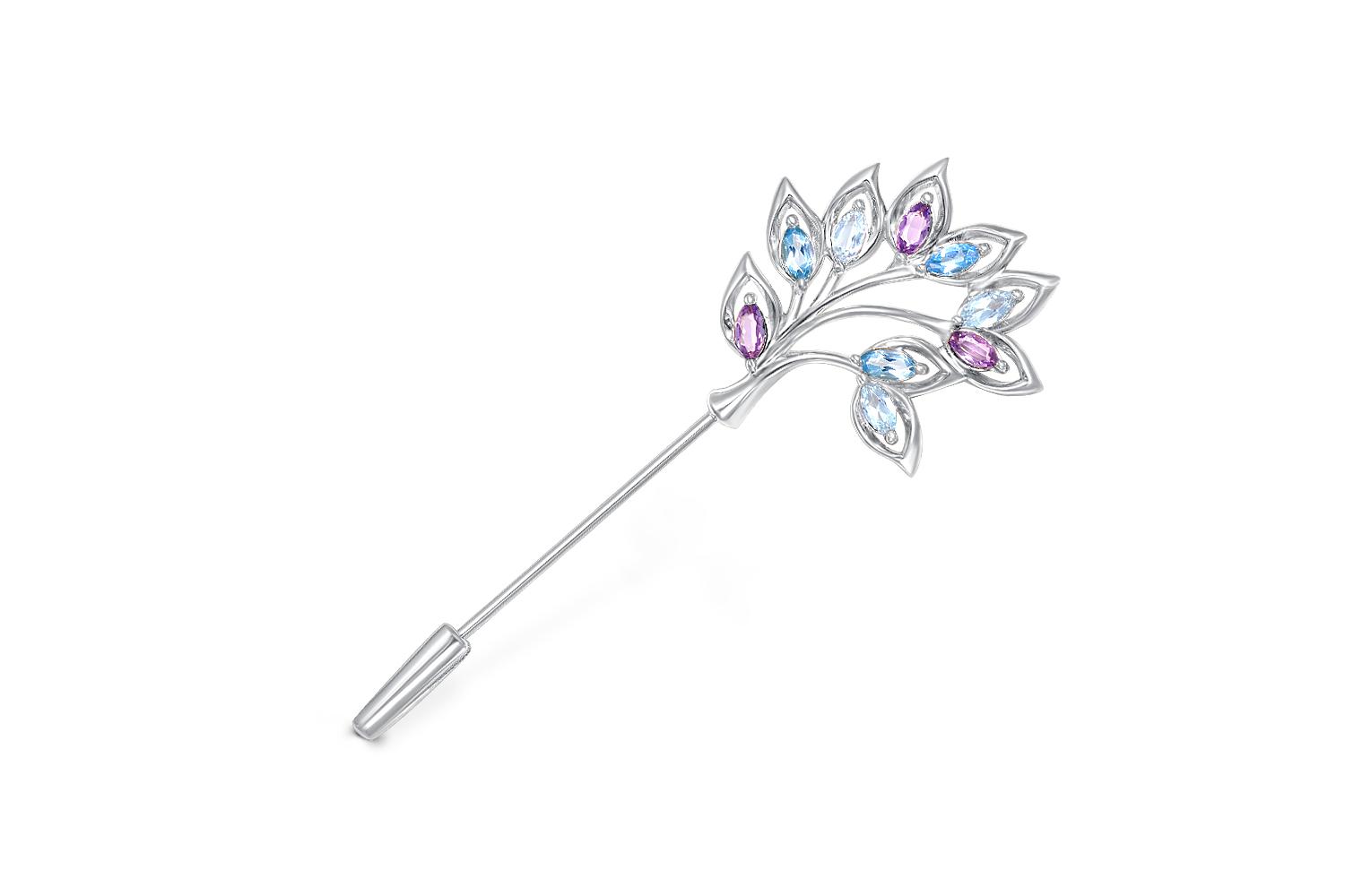 Мастера компании NEWGOLD, приложив всё свое мастерство и искусство, создали для Вас на нашем собственном производстве Брошь Цветок из белого золота с аметистами, топазами sky и топазами swiss.