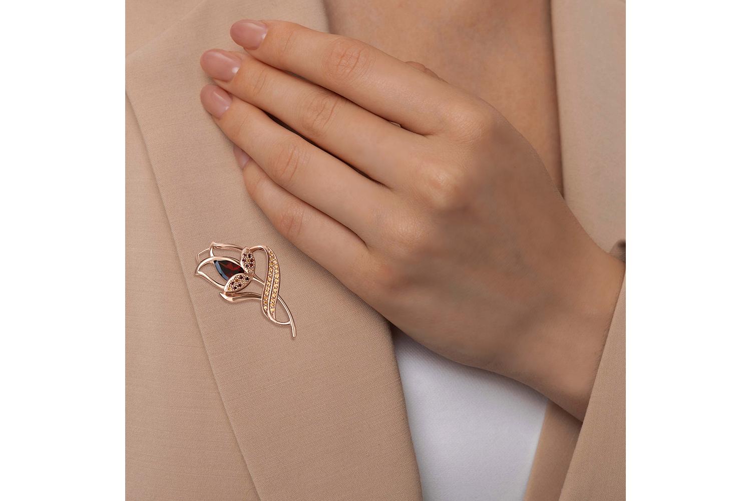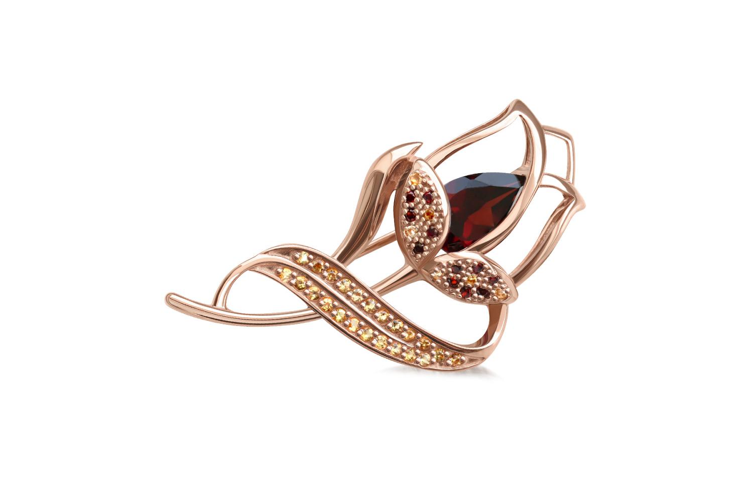 Мастера компании NEWGOLD, приложив всё свое мастерство и искусство, создали для Вас на нашем собственном производстве Брошь Цветок из красного золота с 12 гранатами и 29 цитринами.