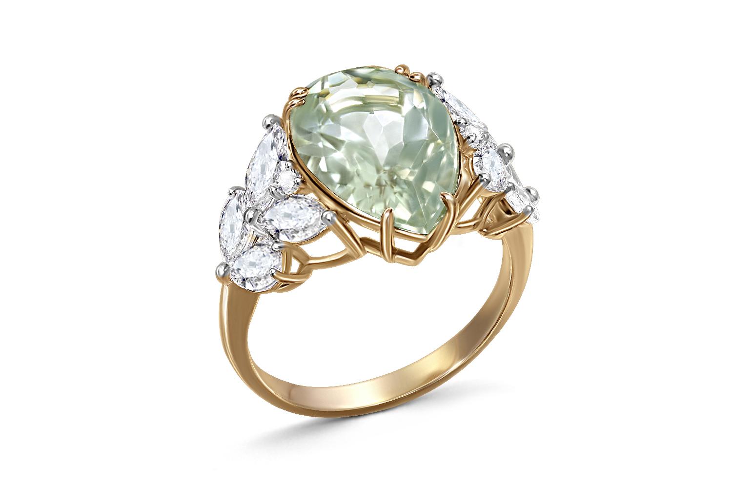 Аметист зеленый натуральный, количество 1 шт., огранка груша, размер 15ˣ10 ; Фианит б/цв, количество 4 шт., огранка маркиз, размер 6ˣ3 ; Фианит б/цв, количество 4 шт., огранка груша, размер 5ˣ3 ; Фианит б/цв, количество 2 шт., огранка круг, размер 1,75