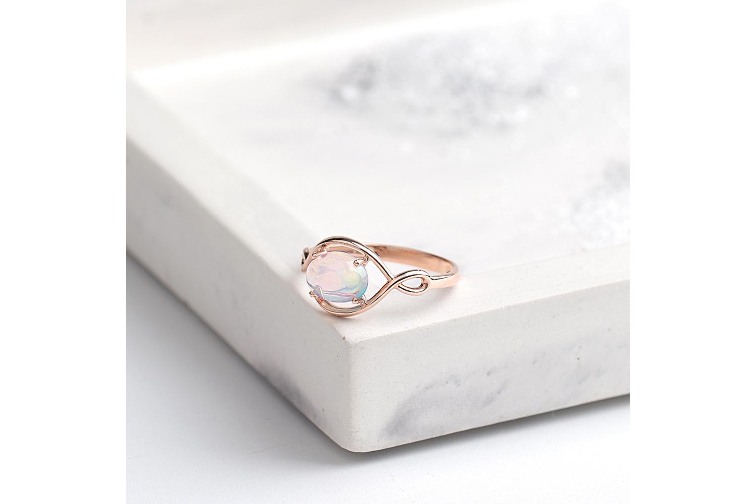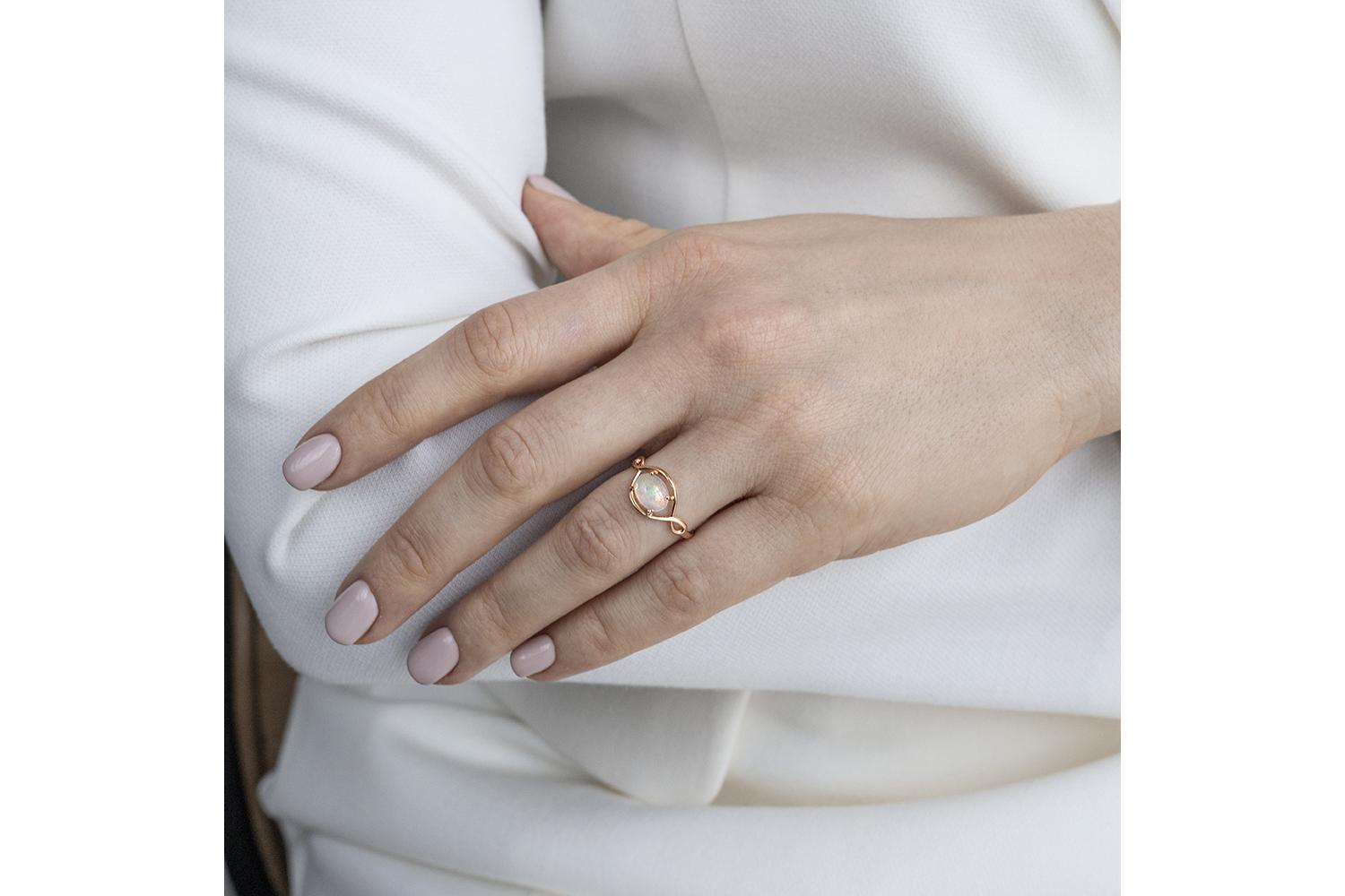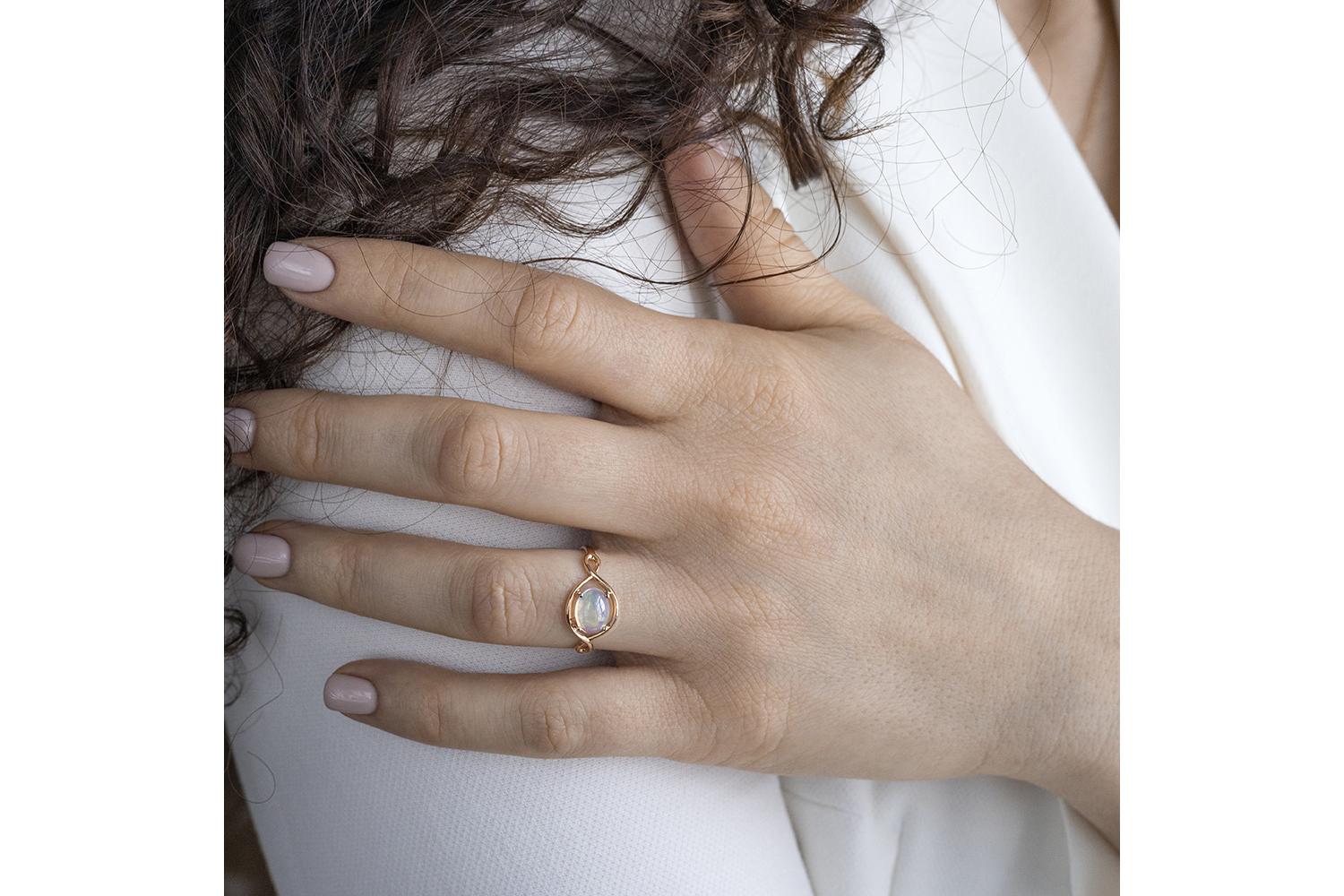 Изысканная оправа удерживает опал четырьмя элегантными лапками, позволяя камню максимально раскрыть свою внутреннюю игру света. Кольцо выглядит воздушным, невесомым - как будто создано для романтичной особы с тонким художественным вкусом. Технически безупречное ювелирное изделие, которое может стать изысканным подарком или украшением для особенного случая.