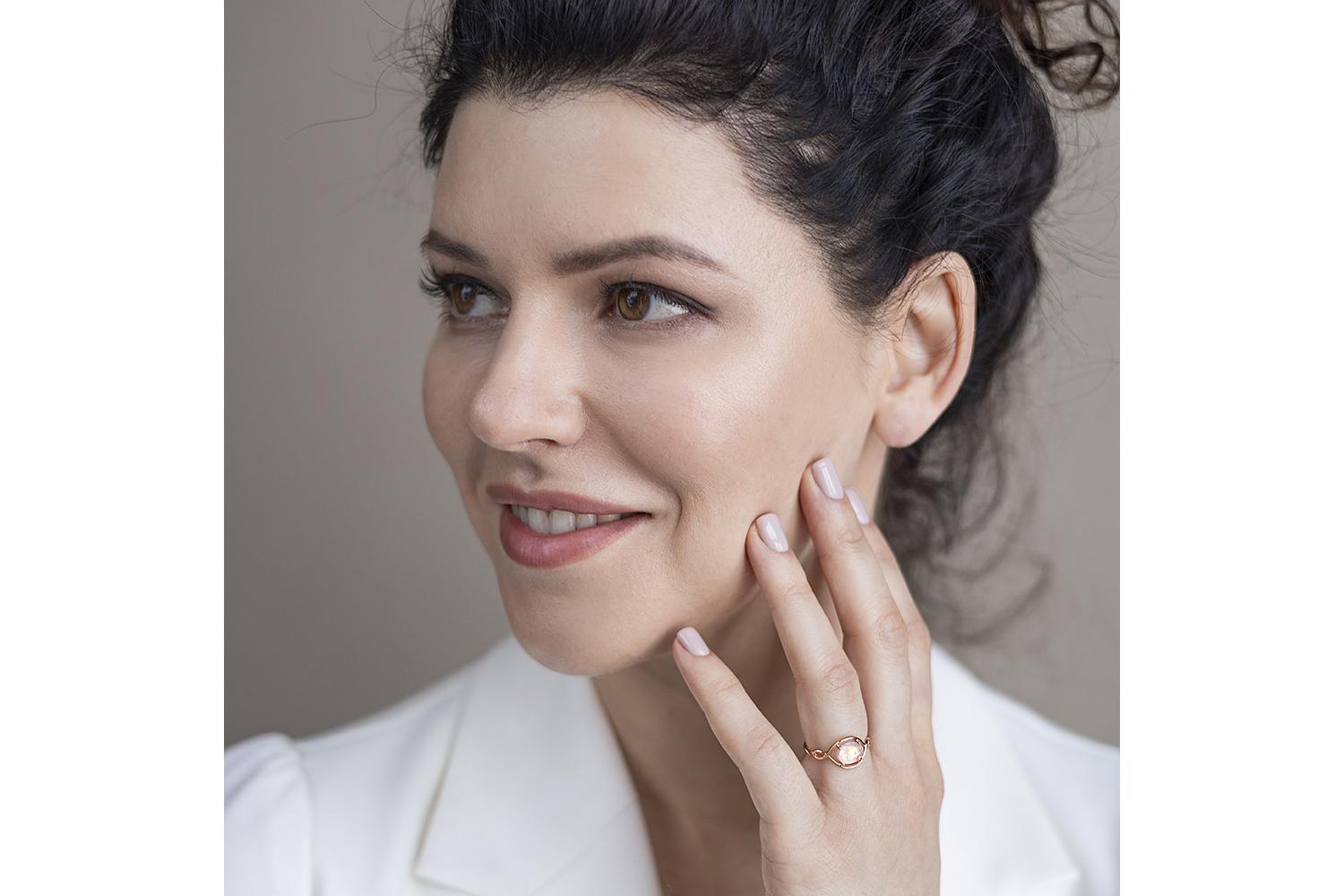 Нежное кольцо из розового золота, украшенное великолепным опаловым камнем, - истинное воплощение элегантности и женственности. Центральный элемент - полупрозрачный опал с переливающимися перламутрово-радужными оттенками, который словно заключен в изящные объятия металла. Дизайн изделия отличается плавными, текучими линиями - шинка переплетается в нежном узле, огибая драгоценный камень. Золотистый оттенок металла мягкий, теплый - напоминает закатные лучи.