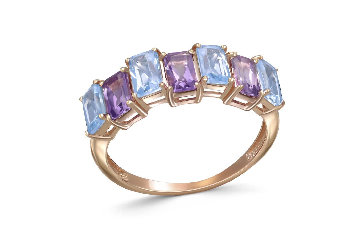 Мастера компании NEWGOLD, приложив всё свое мастерство и искусство, создали для Вас на нашем собственном производстве Кольцо Дорожка из красного золота с 3 аметистами и 4 топазами sky.