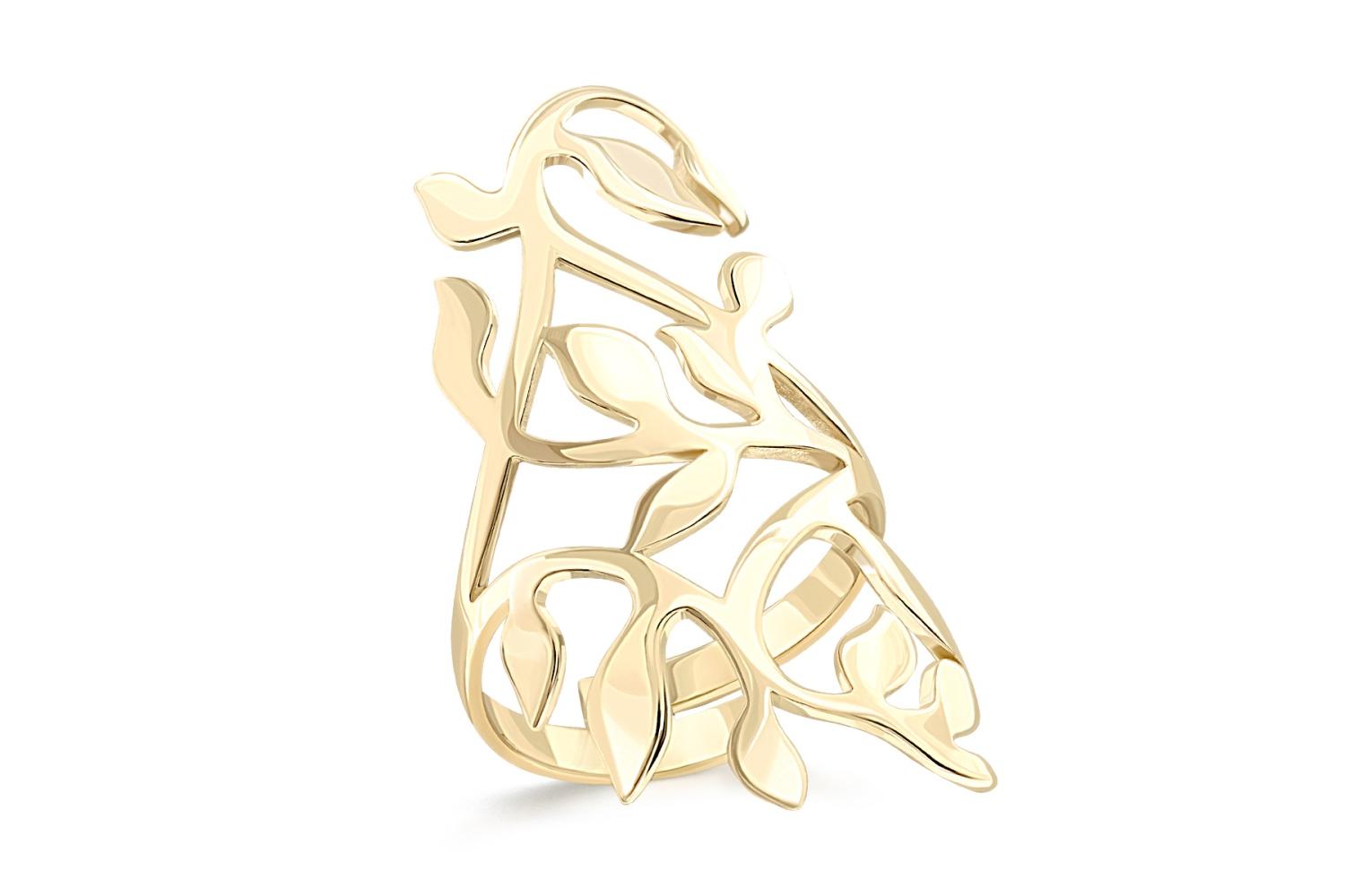 Плавные изгибы металла создают впечатление легкости и воздушности - каждый изгиб словно дуновение ветра, застывшее в золотой форме. Ажурное плетение выглядит невесомым, словно кружевная веточка с миниатюрными листочками.