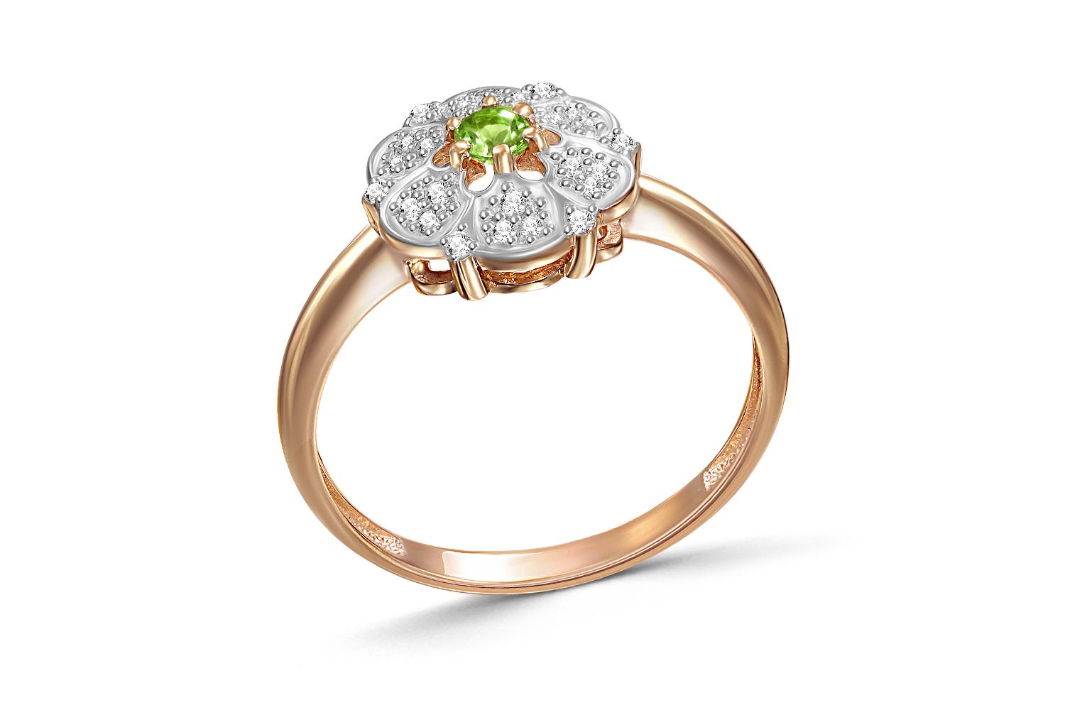 Мастера компании NEWGOLD, приложив всё свое мастерство и искусство, создали для Вас на нашем собственном производстве Кольцо Цветок из красного золота с хризолитом и 24 фианитами.