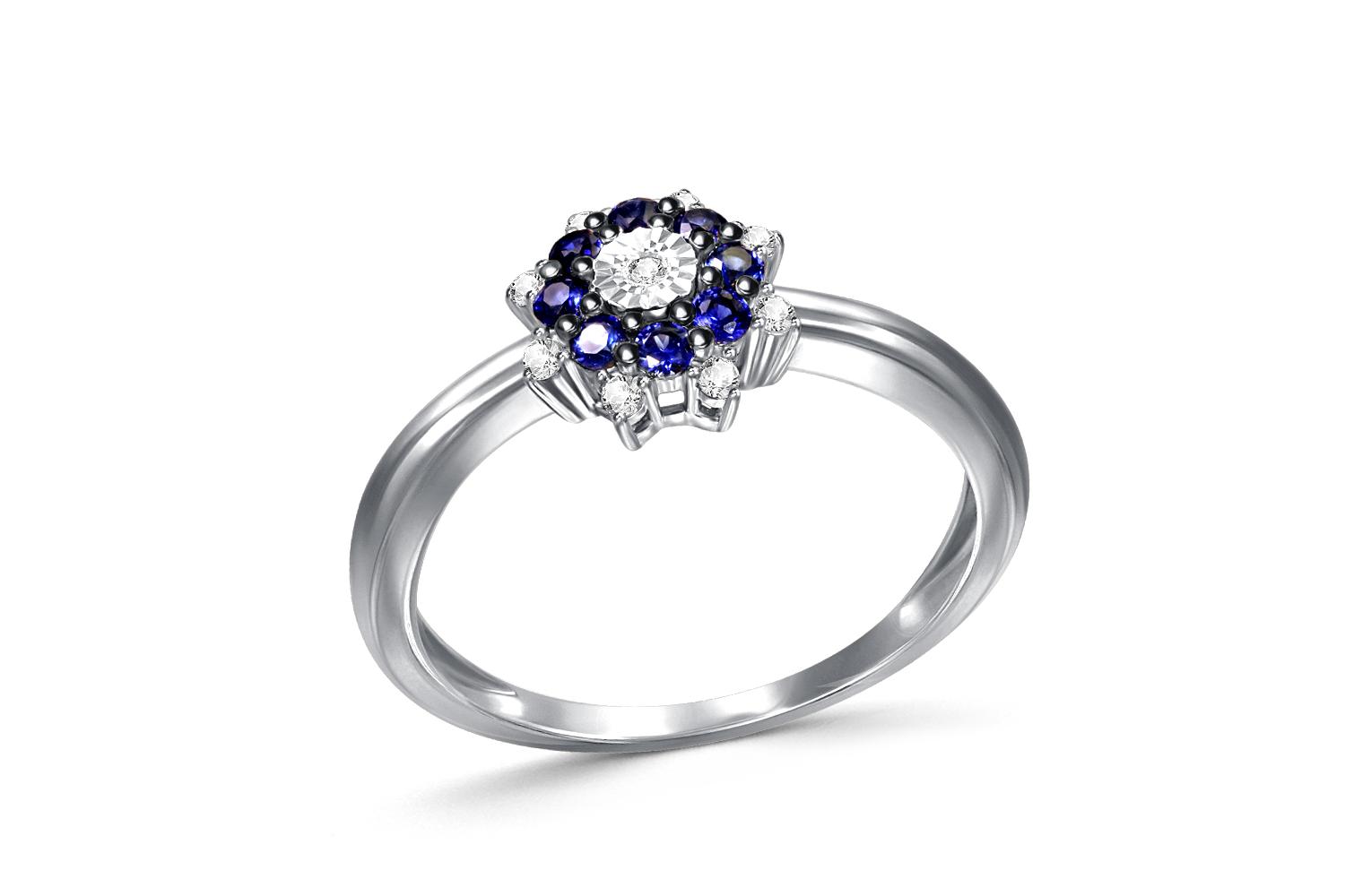 Сапфир натуральный, количество 8 шт., огранка круг, размер 1,75 мм, цвет 3, чистота 3, вес 0,241 карат. ; Бриллиант, количество 8 шт., огранка Кр-57, размер 1,25 мм, цвет 4, чистота 5, вес 0,061 карат. ; Бриллиант, количество 1 шт., огранка Кр-57, разме