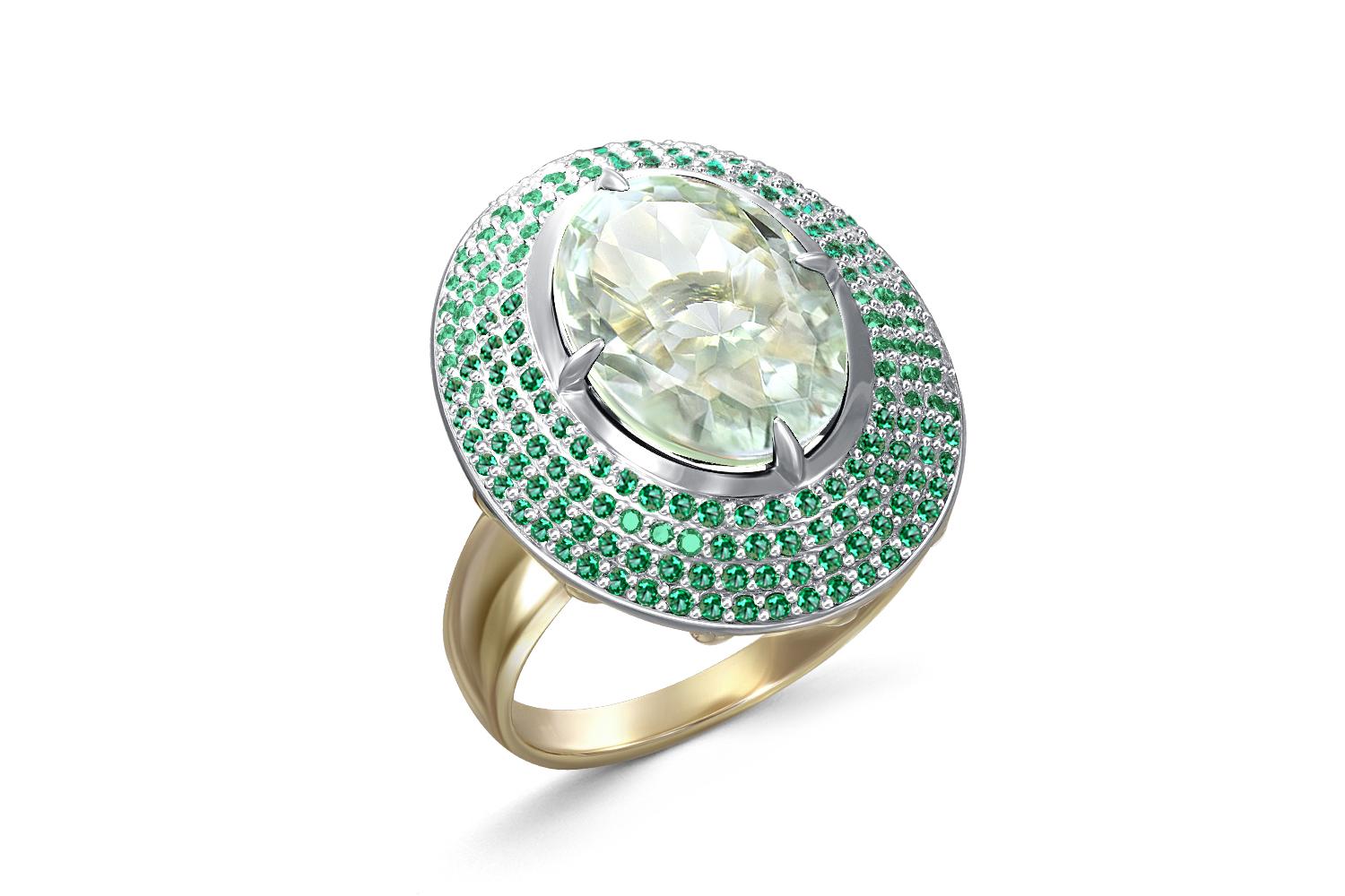Аметист зеленый натуральный, количество 1 шт., огранка овал, размер 14ˣ10 ; Изумруд натуральный, количество 184 шт., огранка круг, размер 1 мм, цвет 3, чистота 3