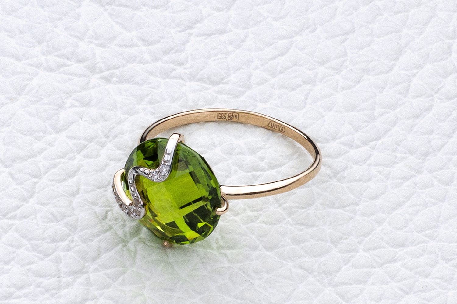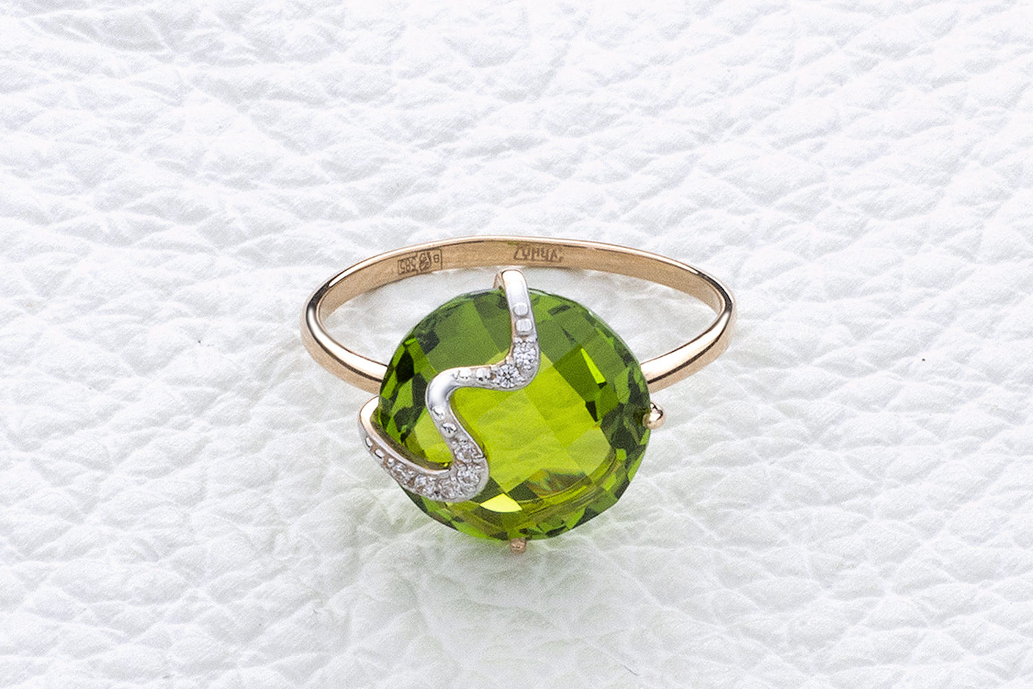 Ситалл хризолит иск, количество 1 шт., огранка круг-бриолет, размер 12 мм ; Фианит б/цв, количество 7 шт., огранка круг, размер 1 мм