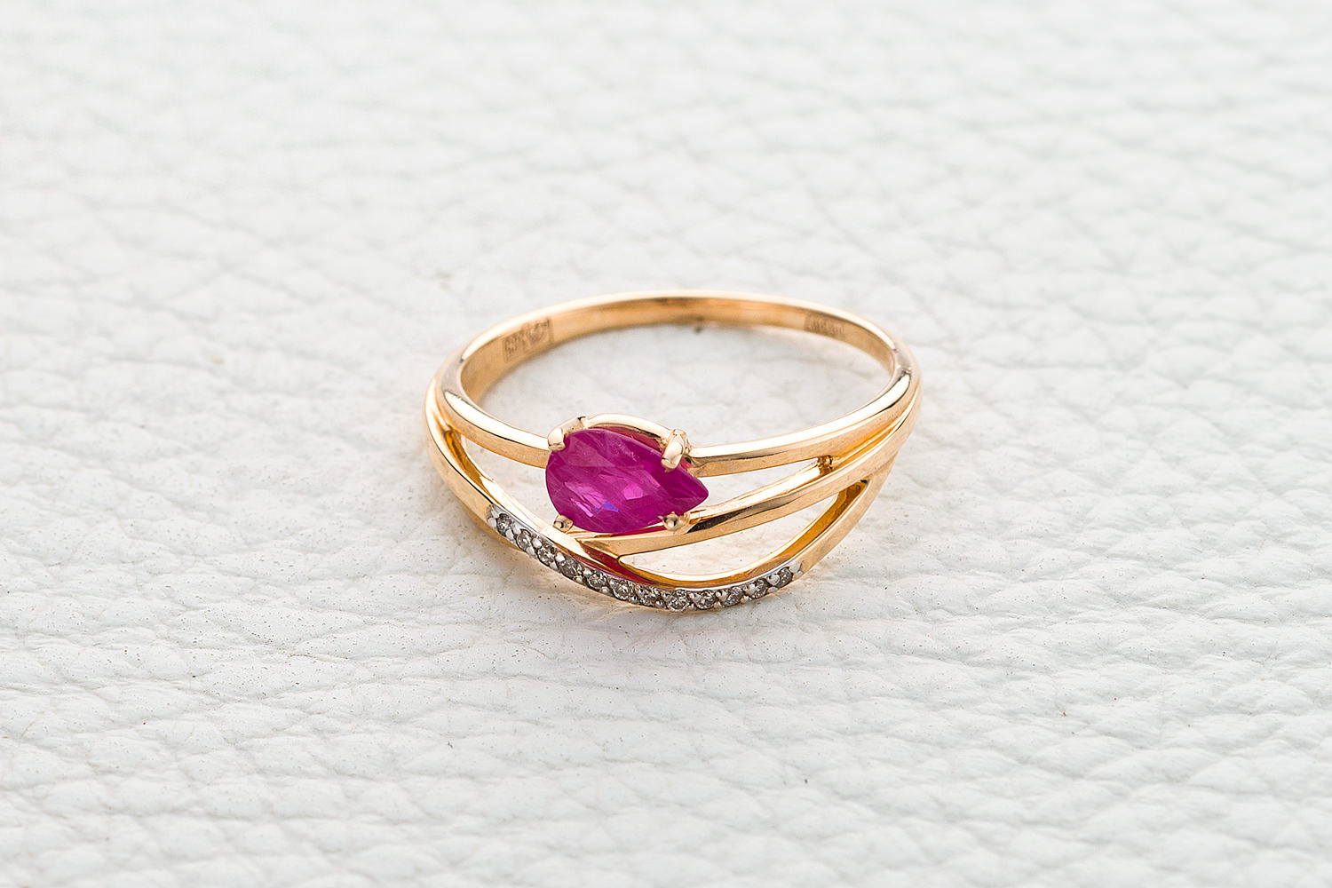 Рубин натуральный, количество 1 шт., огранка груша, размер 7ˣ5, цвет 2, чистота 2, вес 0,95 карат. ; Бриллиант, количество 12 шт., огранка Кр-17, размер 1 мм, цвет 2, чистота 2, вес 0,048 карат.
