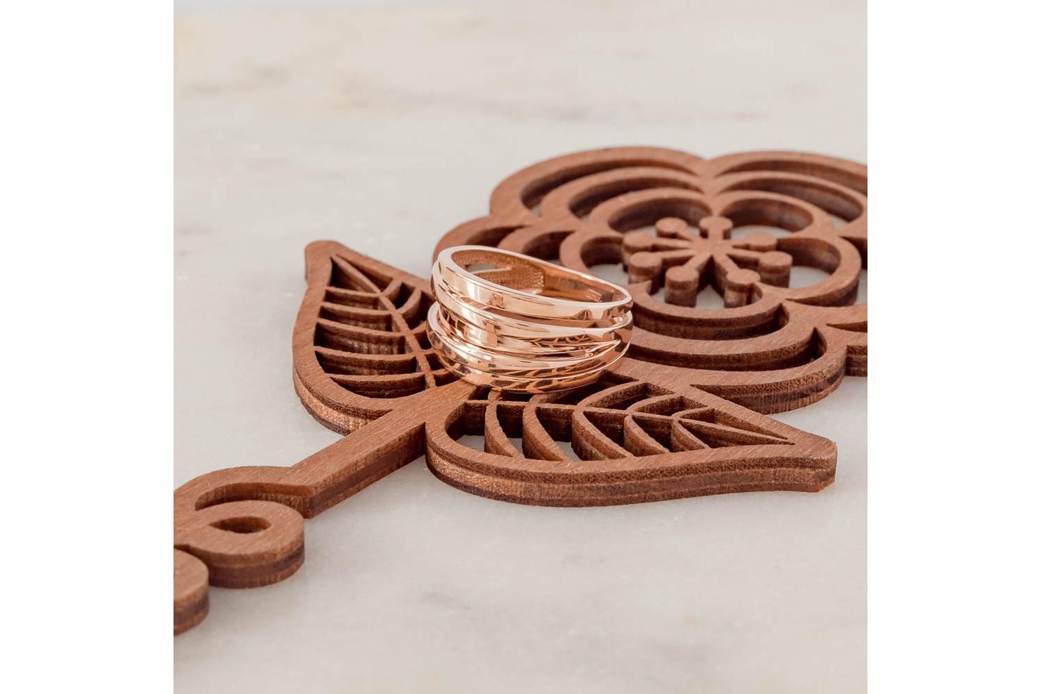 Изящное золотое кольцо с многослойной волнообразной структурой привлекает внимание своей элегантной геометрией. Плавные изгибы металла создают впечатление динамичности и текучести формы. Ювелирное изделие выполнено в теплых бежево-золотых тонах, с легким блеском, который подчеркивает благородство материала.