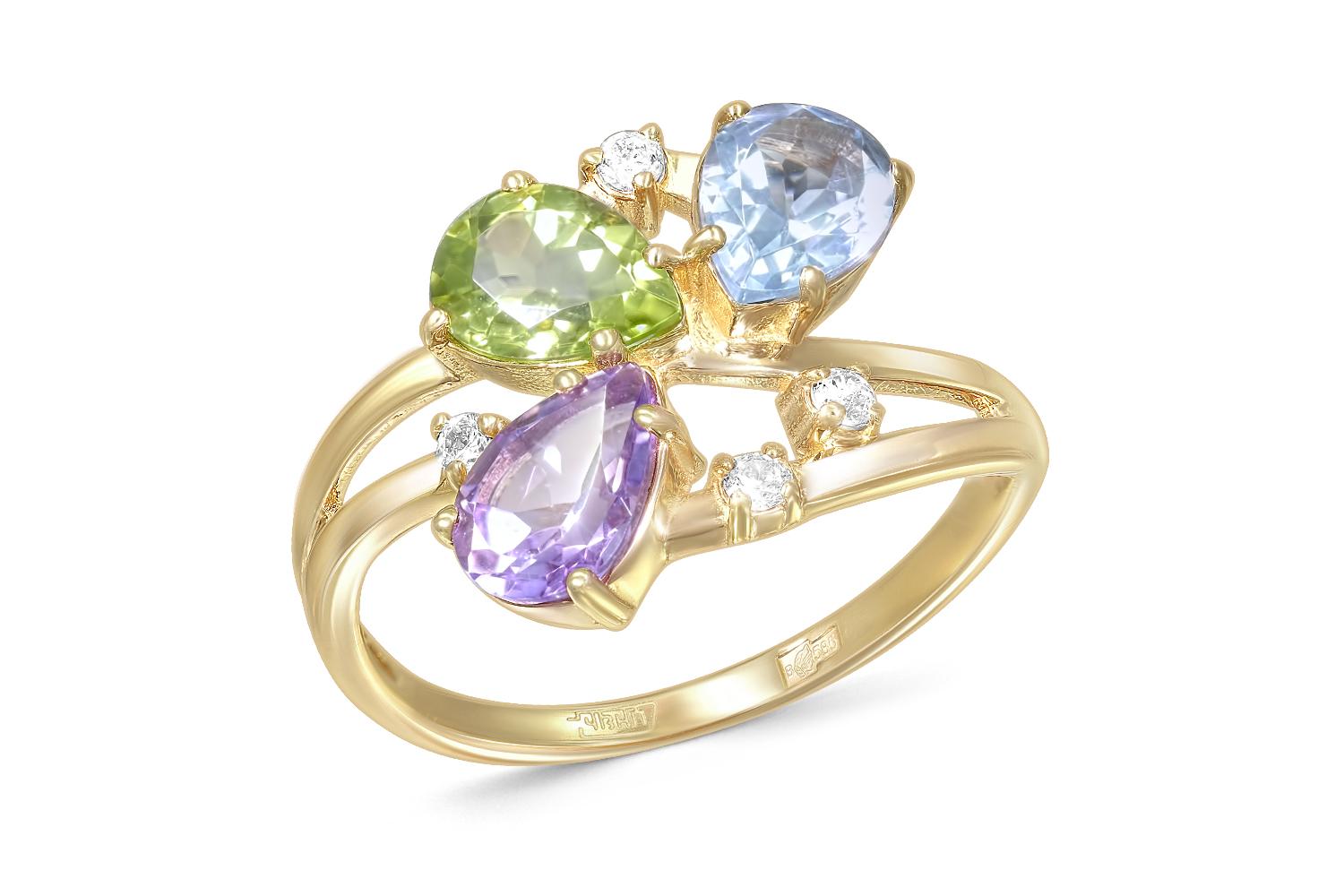 Мастера компании NEWGOLD, приложив всё свое мастерство и искусство, создали для Вас на нашем собственном производстве Кольцо из жёлтого золота с аметистом, топазом sky и хризолитом.