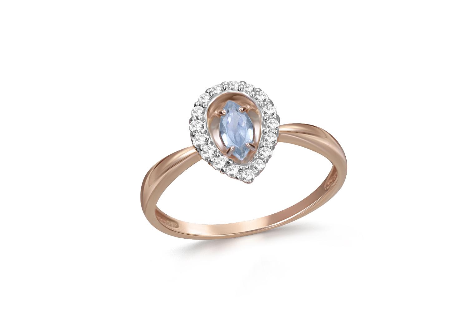 Мастера компании NEWGOLD, приложив всё свое мастерство и искусство, создали для Вас на нашем собственном производстве Кольцо из красного золота с топазом sky и 18 фианитами.