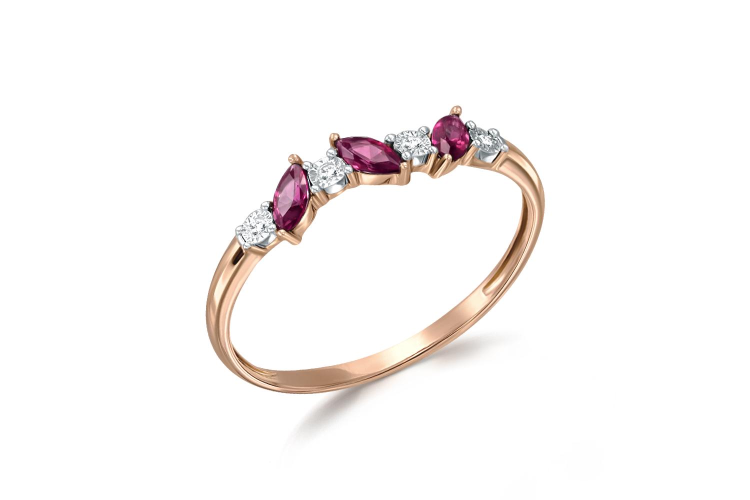 Рубин натуральный, количество 3 шт., огранка маркиз, размер 4ˣ2, цвет 2, чистота 2, вес 0,33 карат. ; Бриллиант, количество 4 шт., огранка Кр-17, размер 1 мм, цвет 2, чистота 2, вес 0,03 карат.