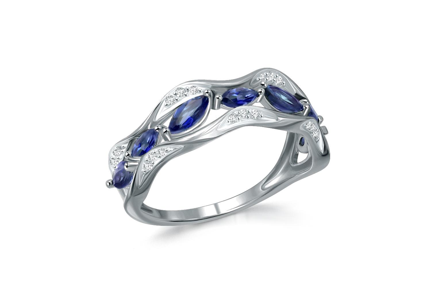 Корунд сапфир синт, количество 4 шт., огранка маркиз, размер 5ˣ2,5 ; Корунд сапфир синт, количество 3 шт., огранка маркиз, размер 4ˣ2 ; Бриллиант, количество 21 шт., огранка Кр-17, размер 0,9 мм, цвет 2, чистота 2