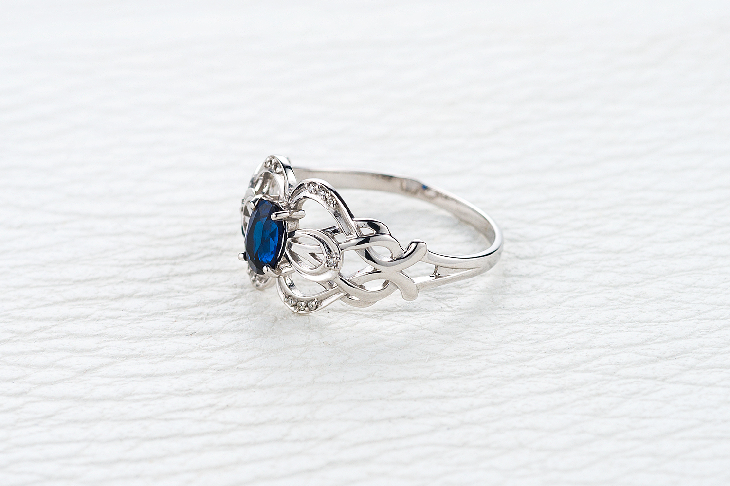 Корунд сапфир синт, количество 1 шт., огранка овал, размер 6ˣ4 ; Бриллиант, количество 14 шт., огранка Кр-17, размер 0,7 мм, цвет 2, чистота 2