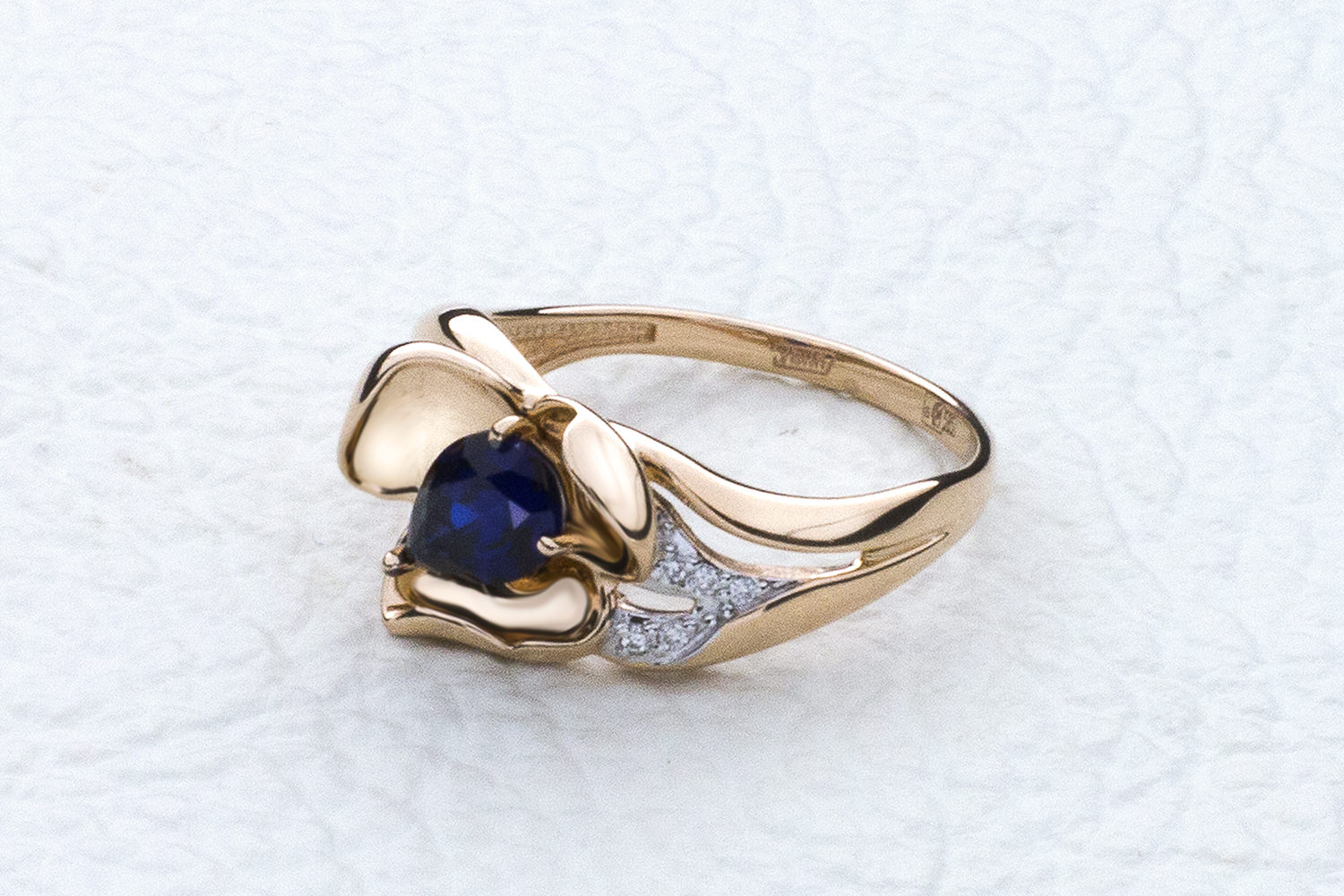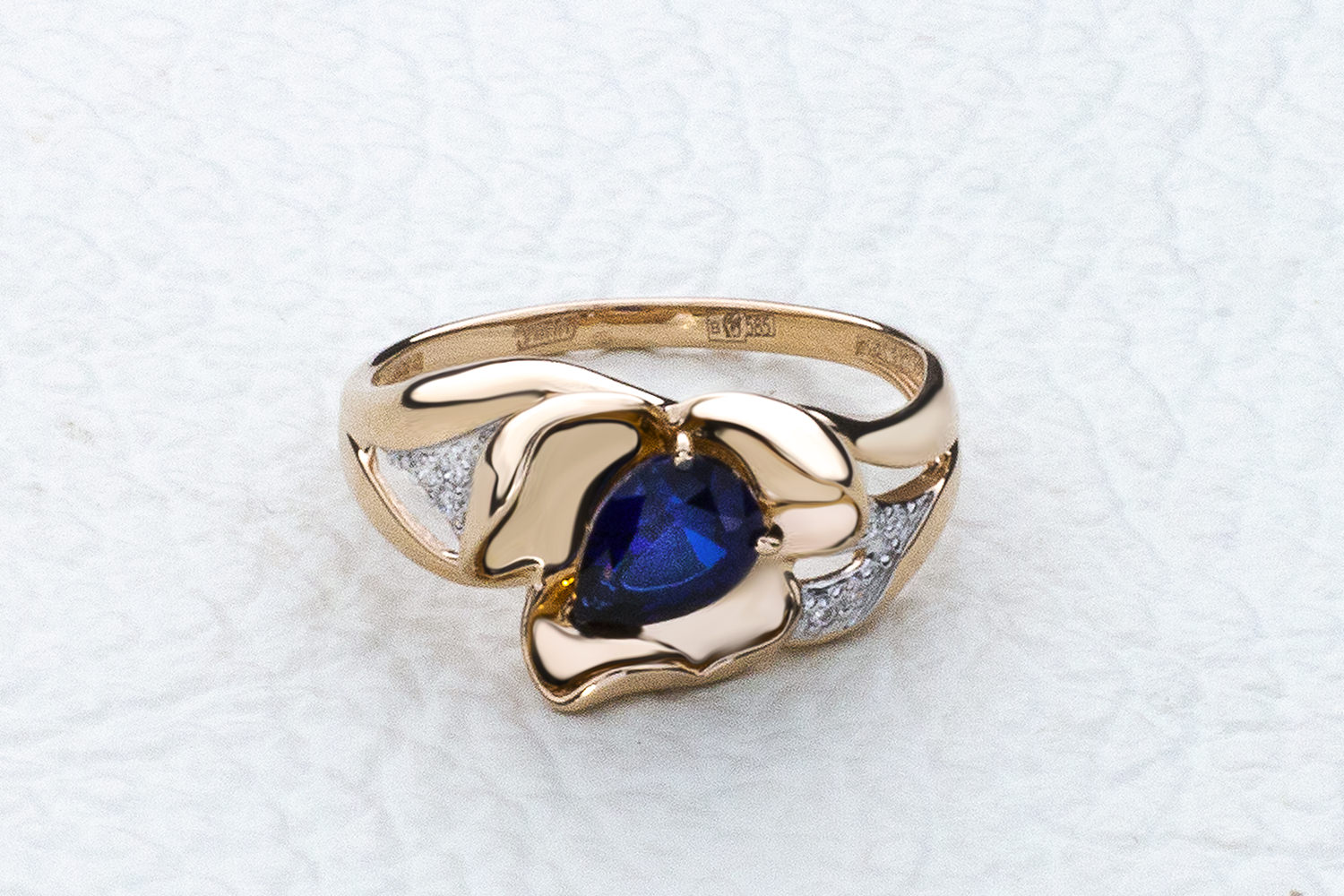 Корунд сапфир синт, количество 1 шт., огранка груша, размер 7ˣ5 ; Бриллиант, количество 11 шт., огранка Кр-57, размер 1 мм, цвет 4, чистота 5