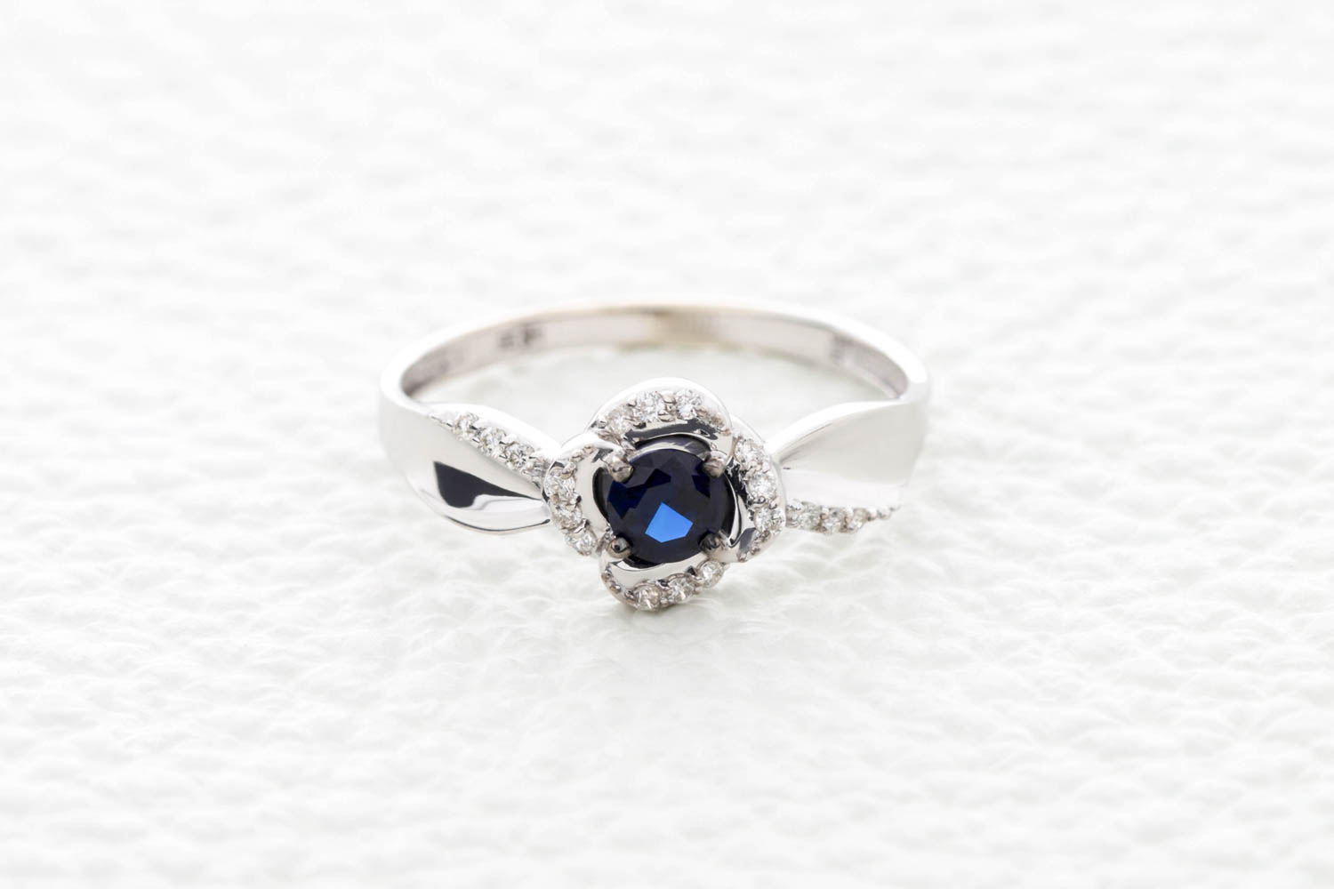 Корунд сапфир синт, количество 1 шт., огранка круг, размер 4 мм ; Бриллиант, количество 18 шт., огранка Кр-57, размер 1 мм, цвет 4, чистота 5