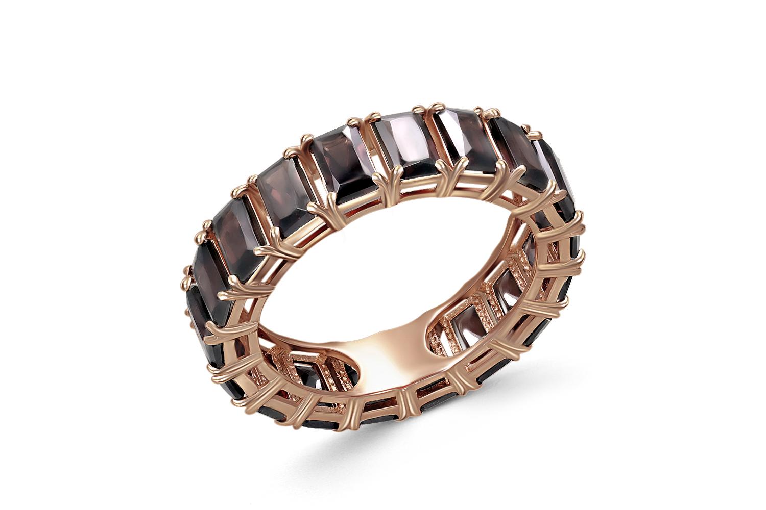 Данное кольцо - истинное воплощение элегантности и геометрической точности. Ювелирное изделие выполнено из розового золота с благородным теплым оттенком, что подчеркивает мягкость и женственность дизайна. Композиция представляет собой дорожку из огранённых раухтопазов - камней с глубоким дымчато-коричневым оттенком. Каждый камень закреплён в изящные лапки, которые создают ажурную, воздушную структуру шинки.