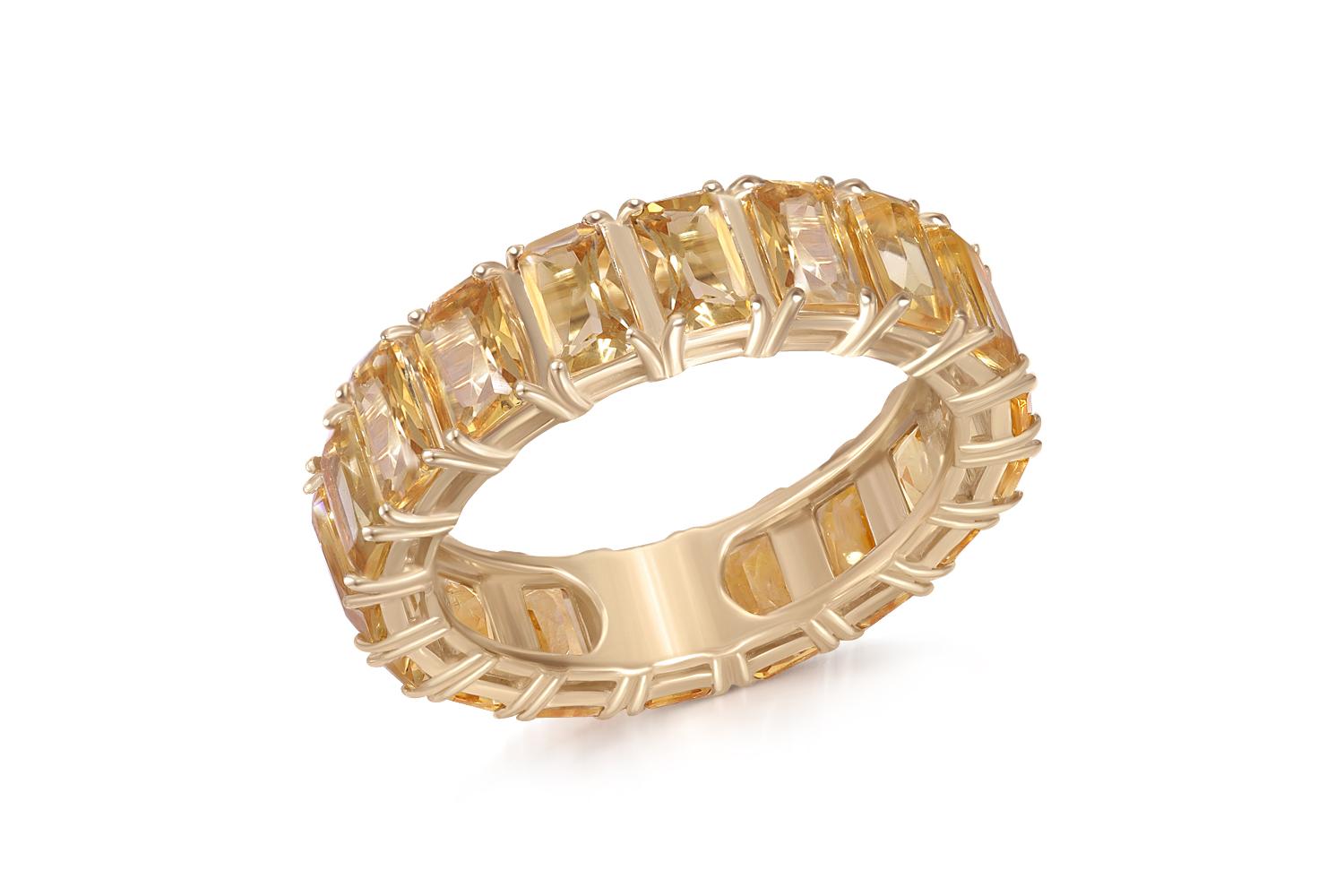 Изысканное кольцо-дорожка, выполненное из желтого золота, представляет собой истинный шедевр ювелирного искусства. Торжественно сияющие цитрины - 20 драгоценных камней изумительного медово-янтарного оттенка - огранены в прямоугольную форму и аккуратно закреплены в изящной металлической оправе.