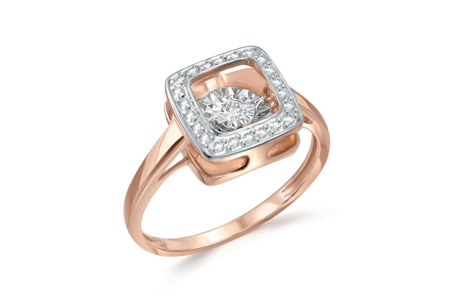 Изысканное ювелирное кольцо с геометрической композицией - истинное воплощение элегантности и современного дизайна. Драгоценное изделие выполнено из розового золота с элементами белого металла, создавая изящный двухцветный акцент. Центральный элемент - бриллиант, который словно парит внутри квадратной оправы. Белые бриллианты обрамляют квадратный контур, придавая украшению торжественность и блеск.