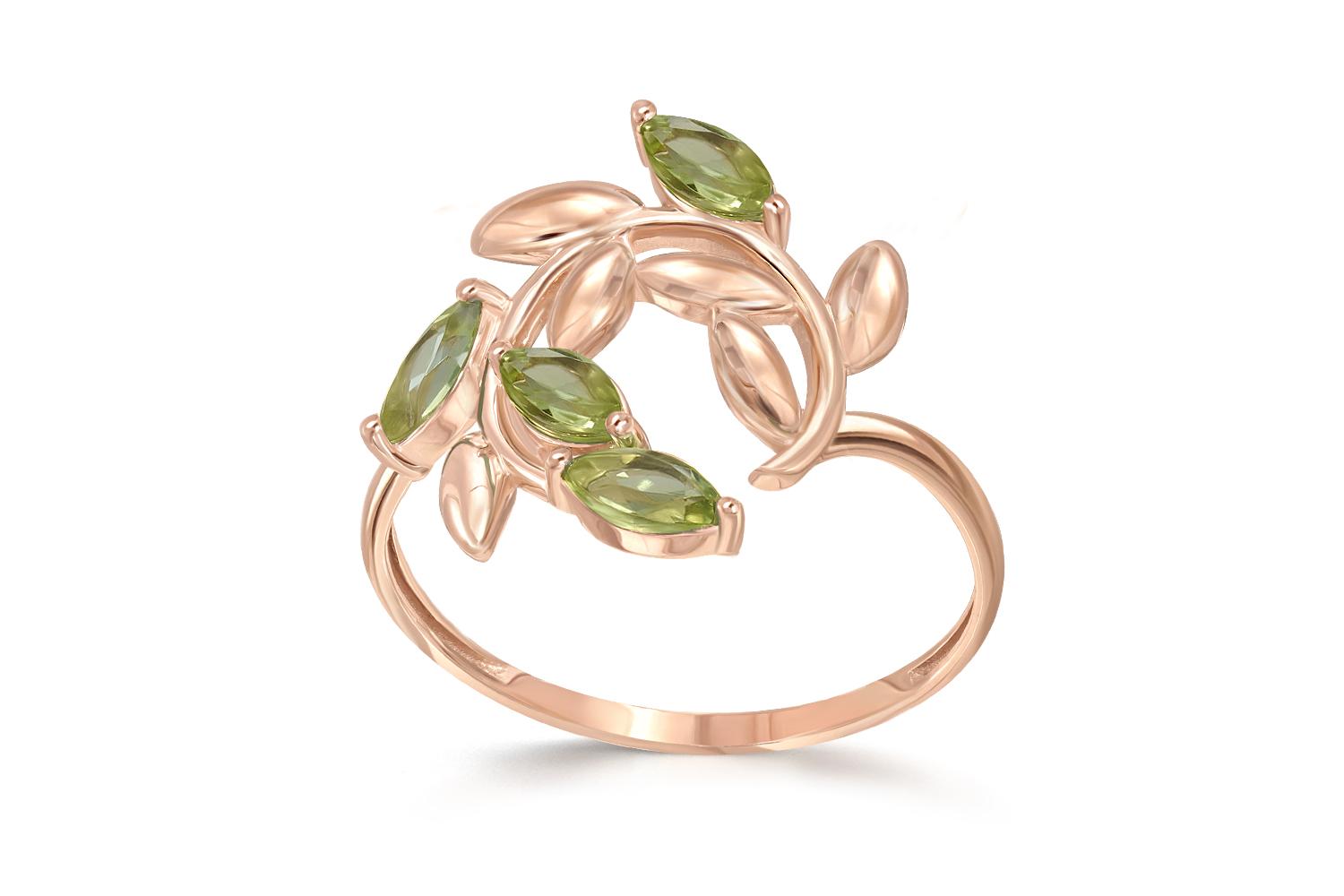 Мастера компании NEWGOLD, приложив всё свое мастерство и искусство, создали для Вас на нашем собственном производстве Кольцо Веточка из красного золота с 4 хризолитами.