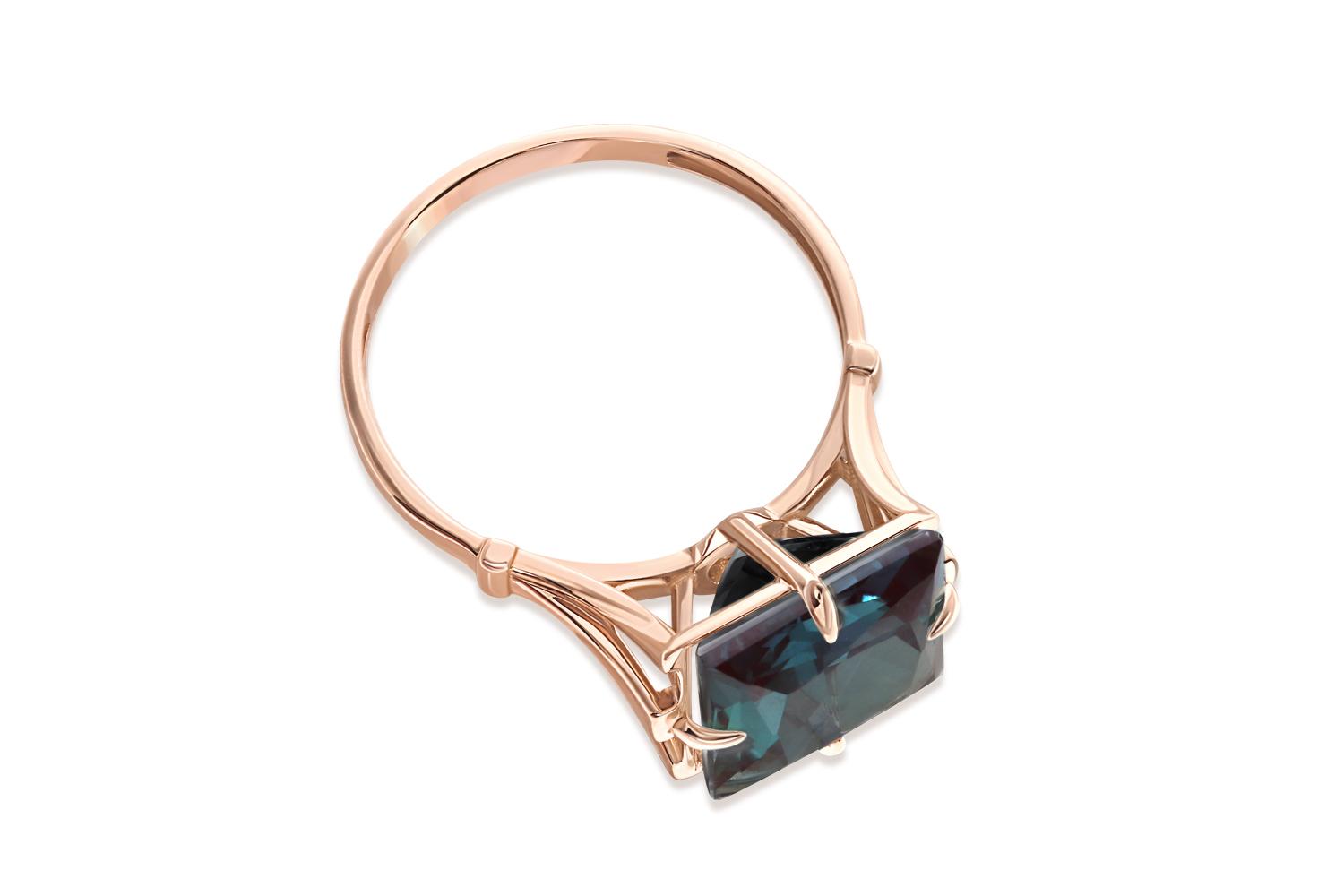Изысканное кольцо с александритом - истинный шедевр ювелирного искусства. Центральный камень - александрит - переливается глубокими оттенками серо-зеленого и синего, характерными для этого редкого драгоценного минерала. Оправа выполнена из красного золота, создающего нежный контраст с холодным блеском александрита. Геометрическая огранка камня в стиле "принцесса" подчеркивает его природную красоту и игру света.