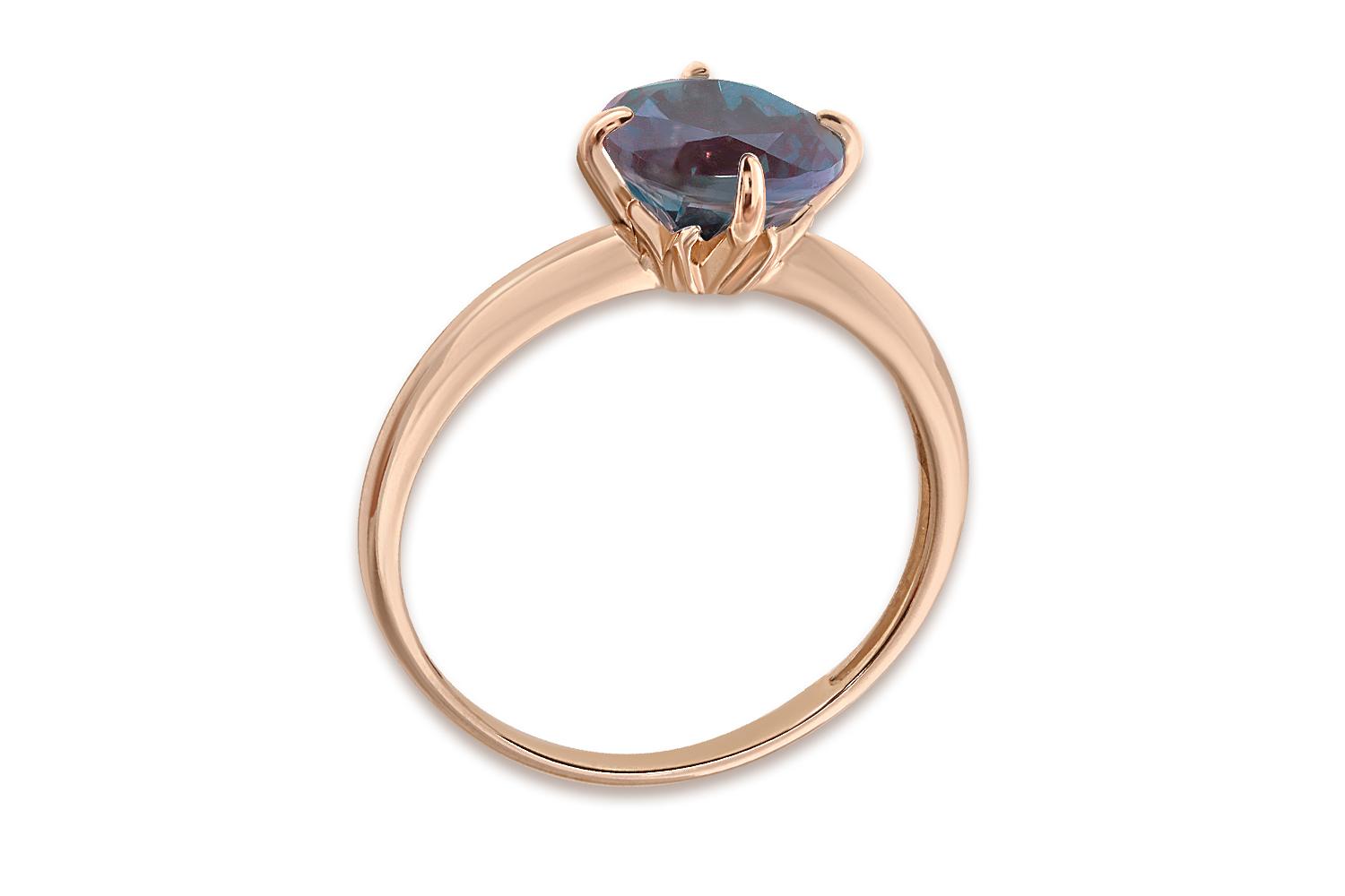 Представленное изделие выполнено из красного золота 585 пробы, что придаёт ему нежный, теплый оттенок. Венчает композицию александрит - изумительный самоцвет, способный менять оттенок в зависимости от освещения: от сине-зеленых тонов до глубоких фиолетово-красных. Центральный камень огранён классической бриллиантовой огранкой - с множеством граней, играющих и переливающихся при малейшем движении. Четыре изящных лапки надёжно фиксируют драгоценный минерал, подчёркивая его геометрию и блеск.