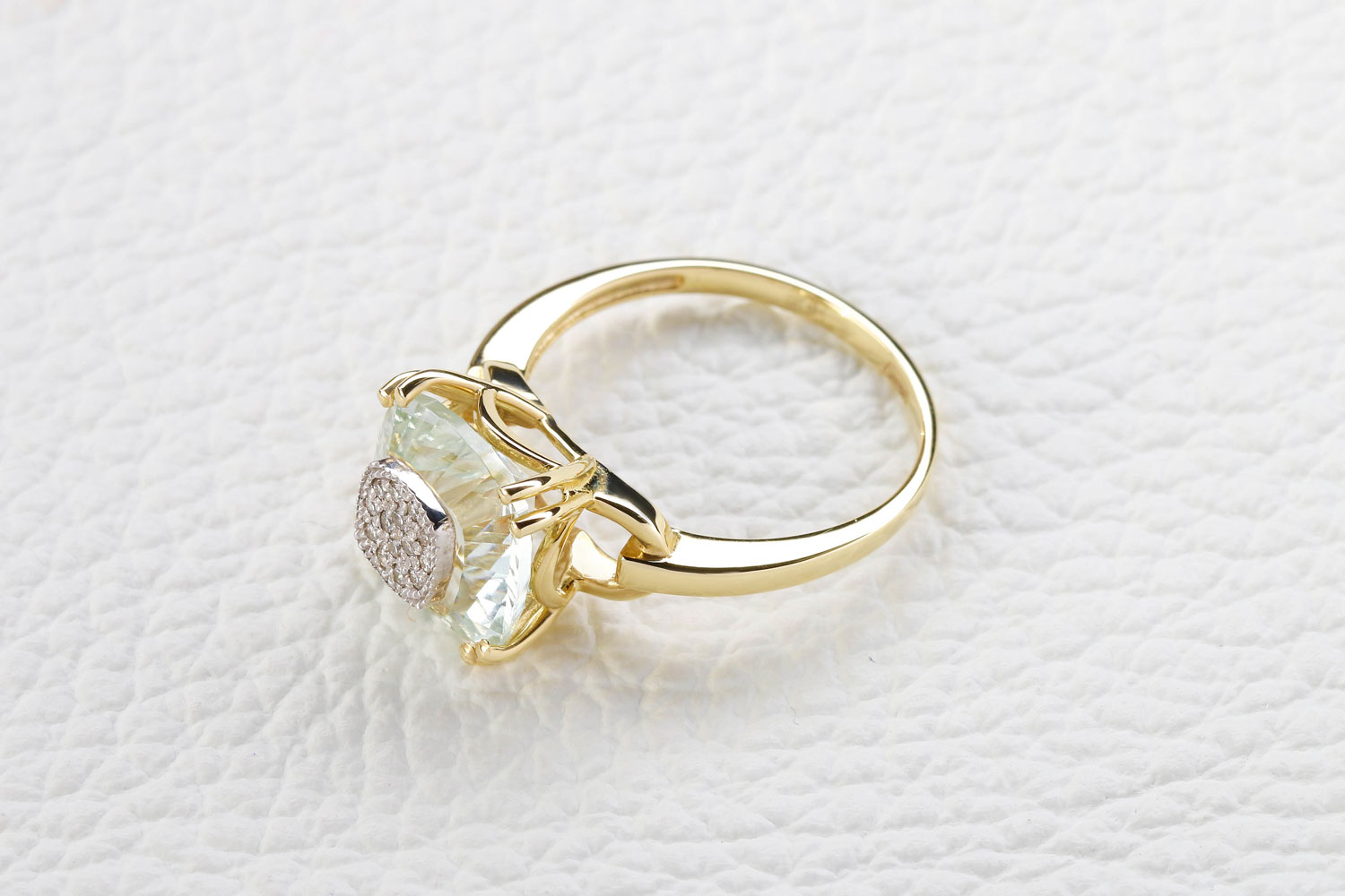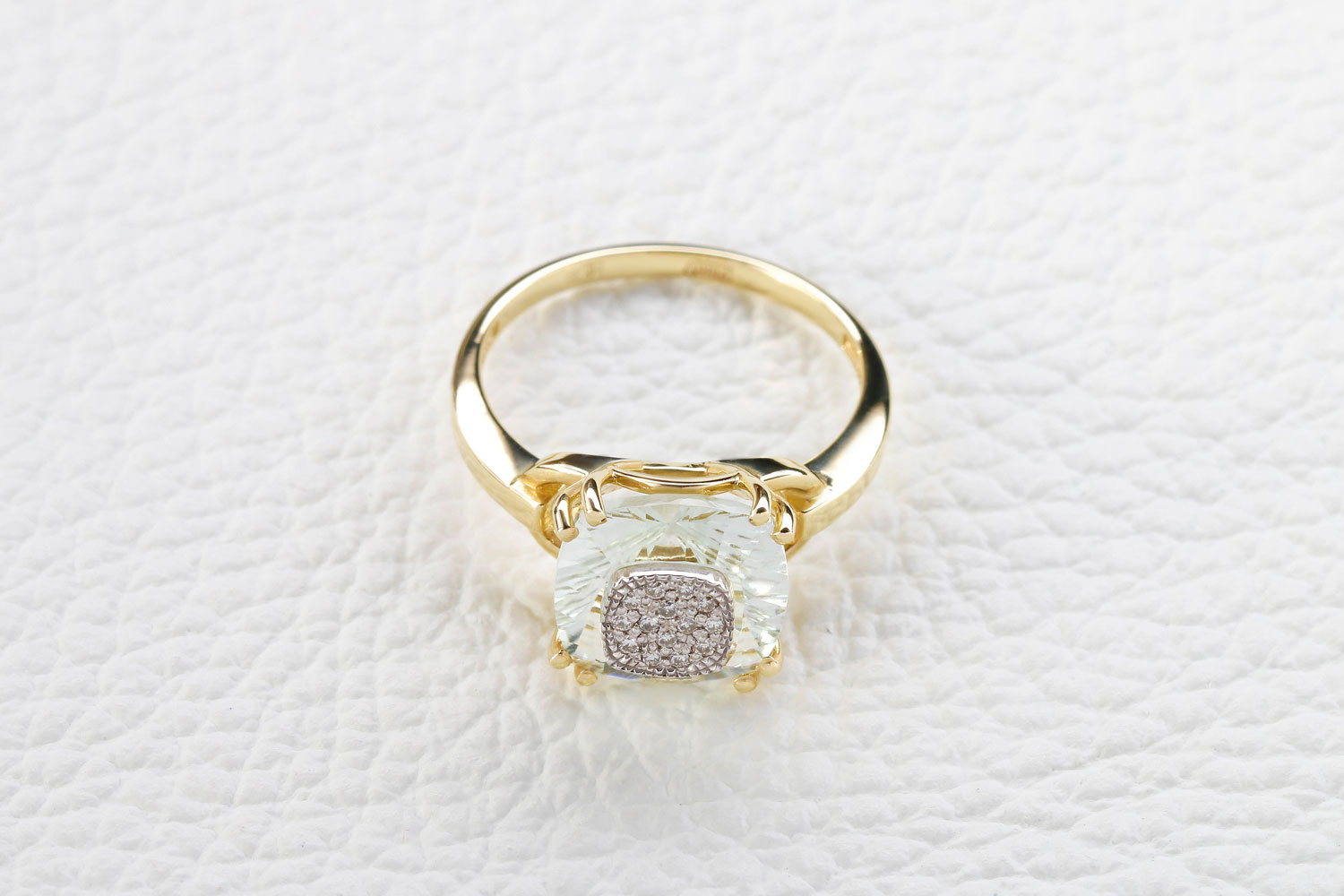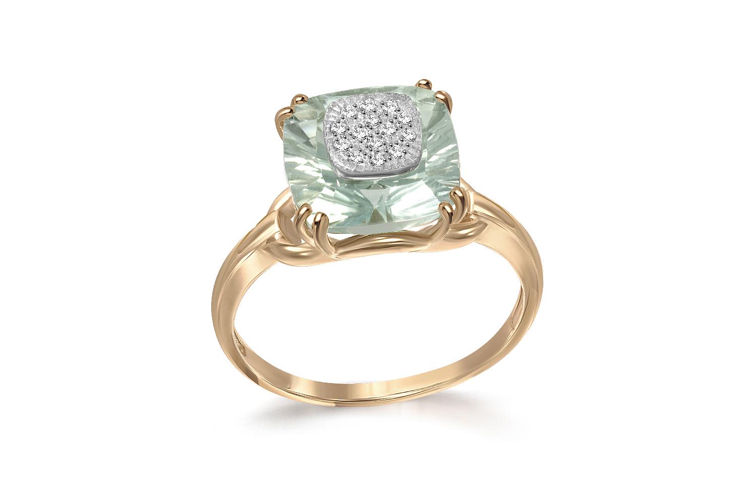 Аметист зеленый натуральный, количество 1 шт., огранка антик с отв., размер 10ˣ10 ; Бриллиант, количество 14 шт., огранка Кр-57, размер 1 мм, цвет 4, чистота 5, вес 0,06 карат.