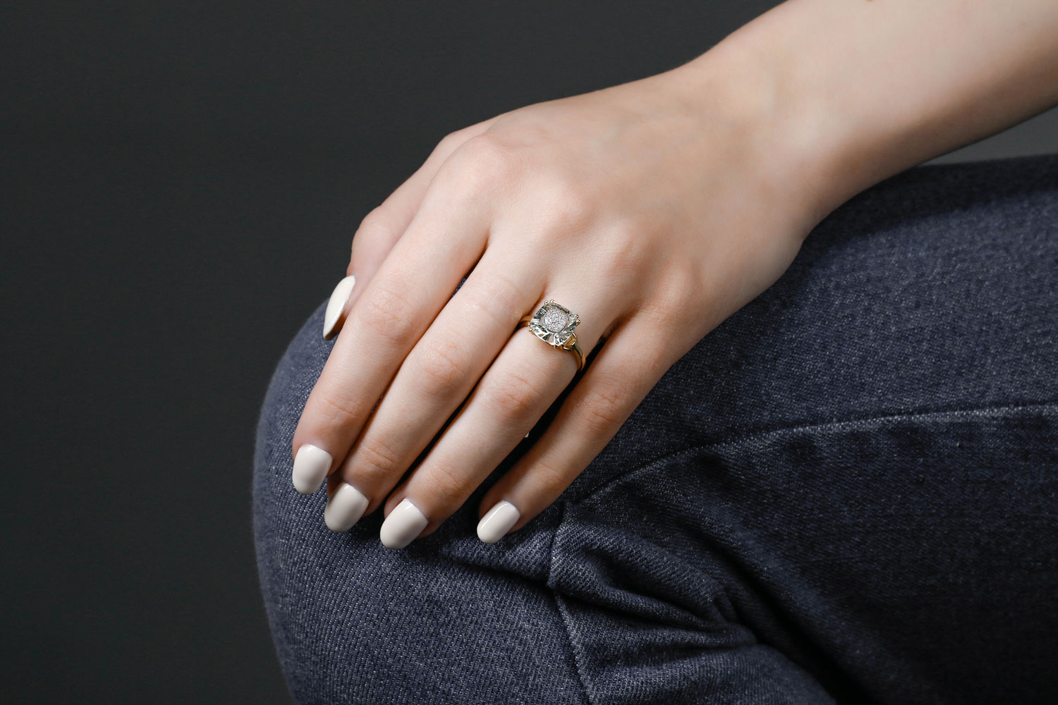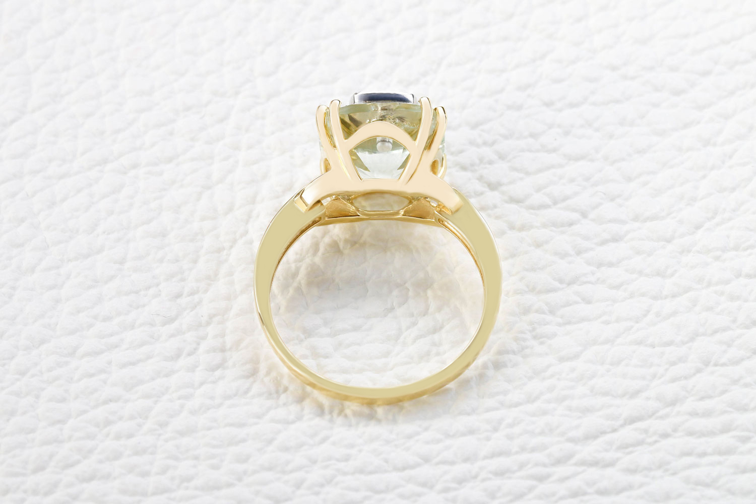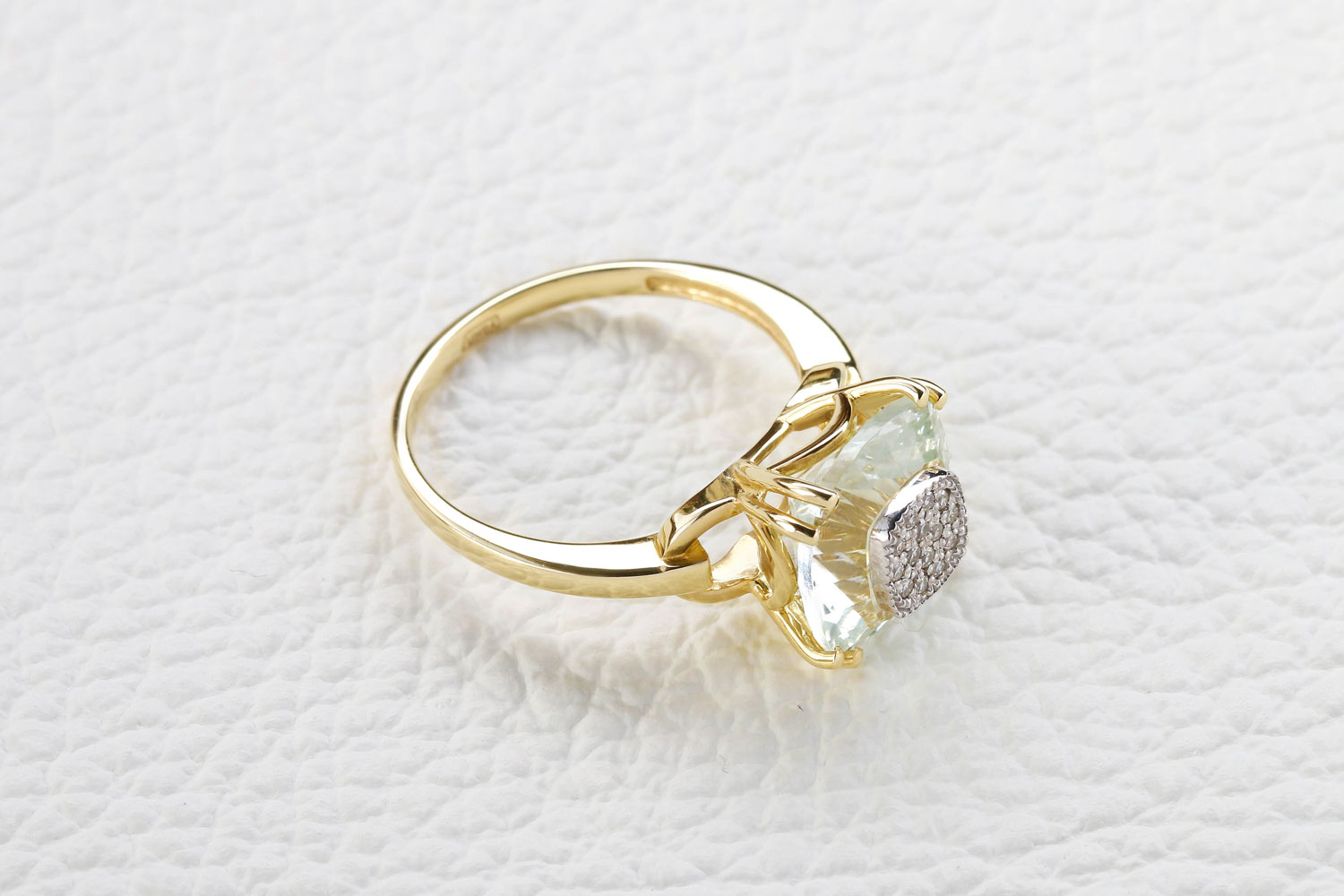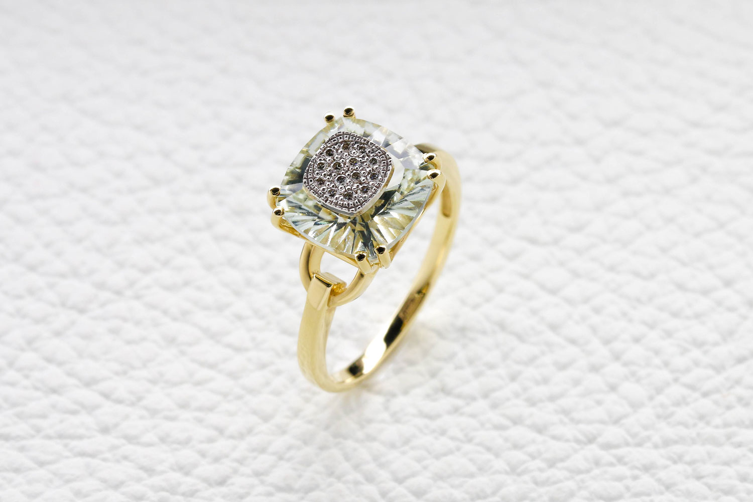 Аметист зеленый натуральный, количество 1 шт., огранка антик с отв., размер 10ˣ10 ; Бриллиант, количество 14 шт., огранка Кр-57, размер 1 мм, цвет 4, чистота 5, вес 0,06 карат.
