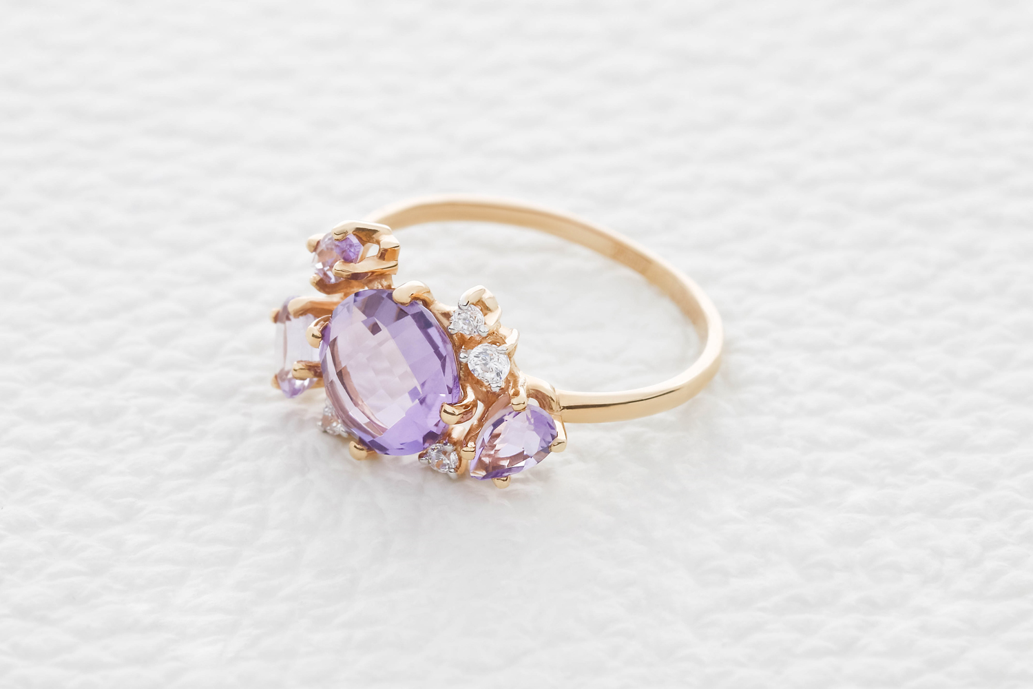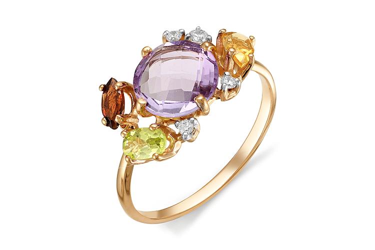Мастера компании NEWGOLD, приложив всё свое мастерство и искусство, создали для Вас на нашем собственном производстве Кольцо из красного золота с аметистом, гранатом и хризолитом.