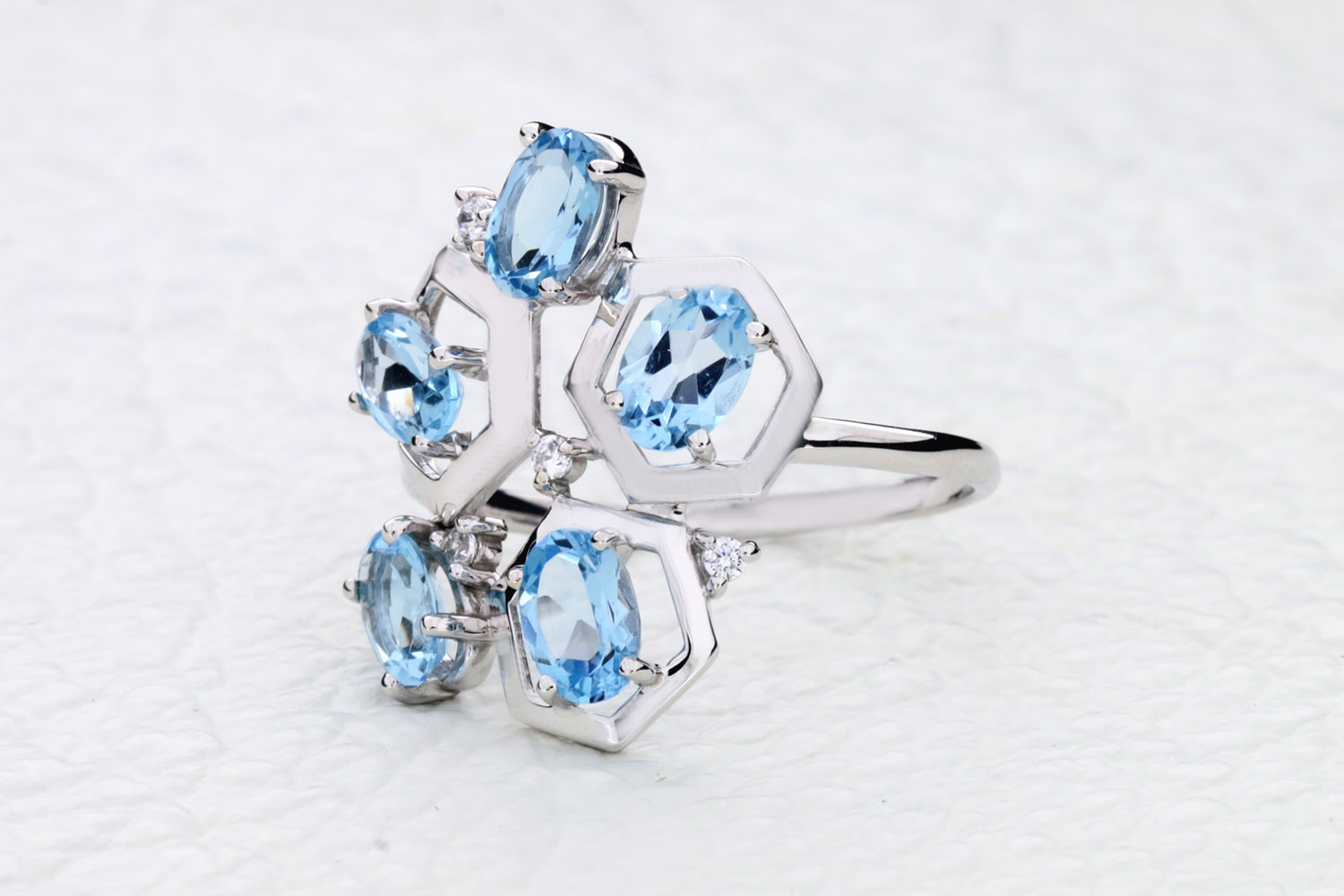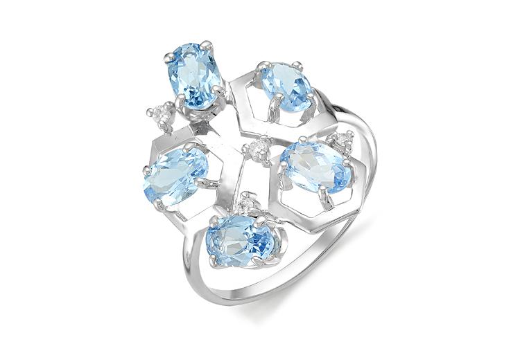 Мастера компании NEWGOLD, приложив всё свое мастерство и искусство, создали для Вас на нашем собственном производстве Кольцо из белого золота с 5 топазами swiss и 4 фианитами.