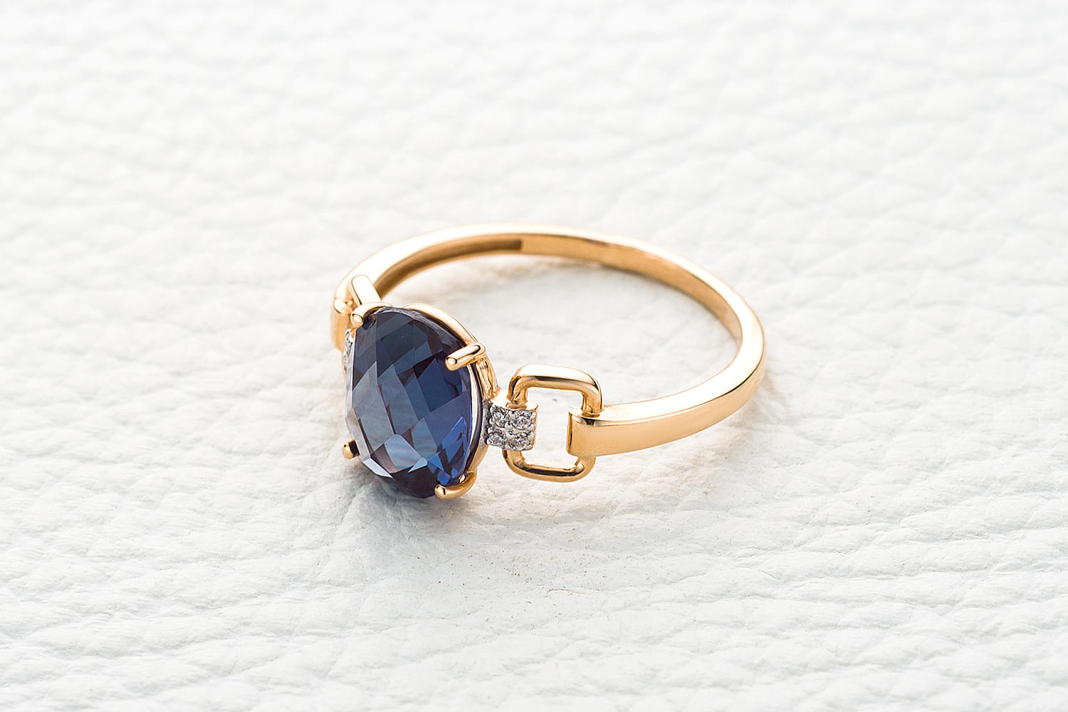 По бокам от драгоценного камня - миниатюрные вставки, которые мягко обрамляют центр композиции. Металл - красное золото 585 пробы - создаёт благородный контраст с глубиной цвета камня.
