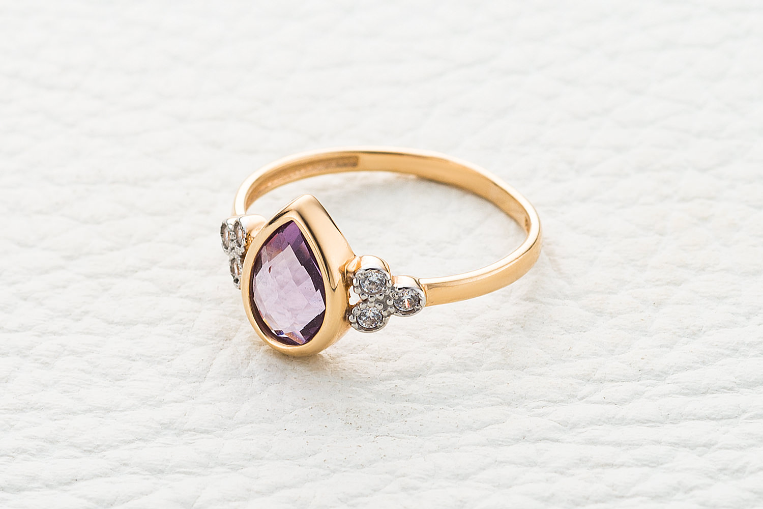 Аметист натуральный, количество 1 шт., огранка груша-бриолет, размер 9ˣ6 ; Фианит б/цв, количество 6 шт., огранка круг, размер 1,5 мм