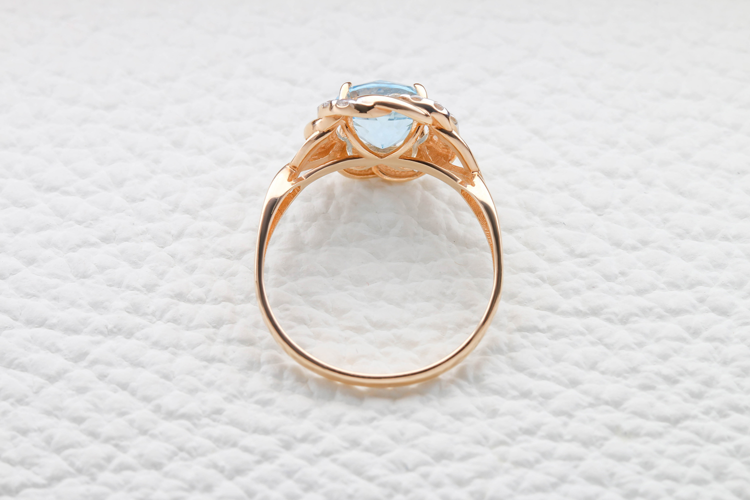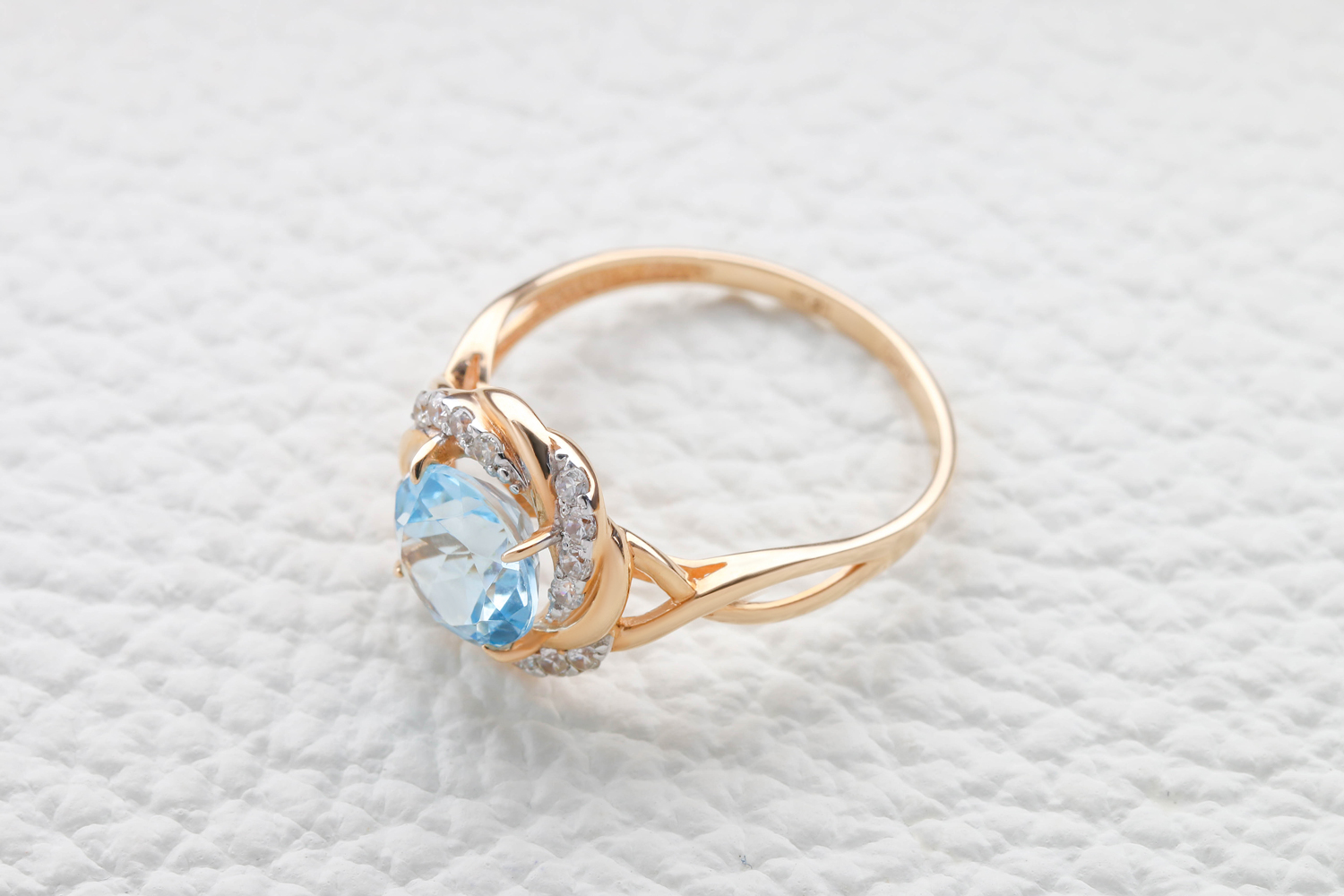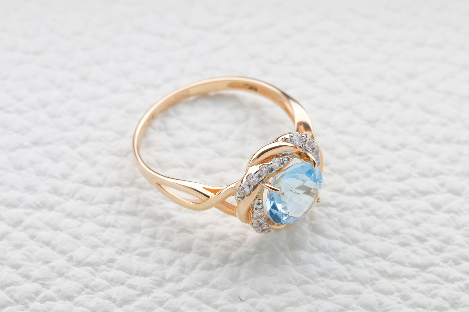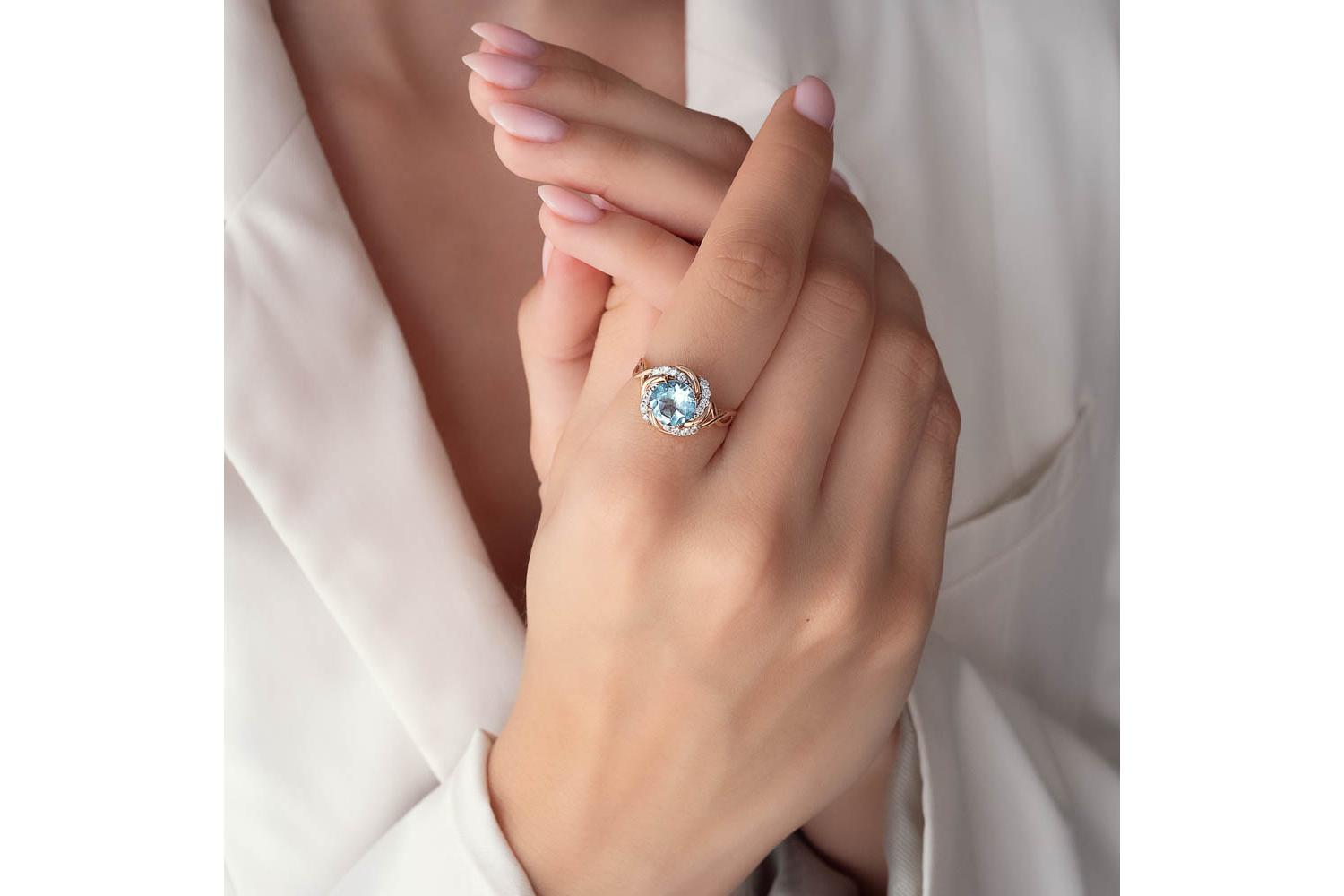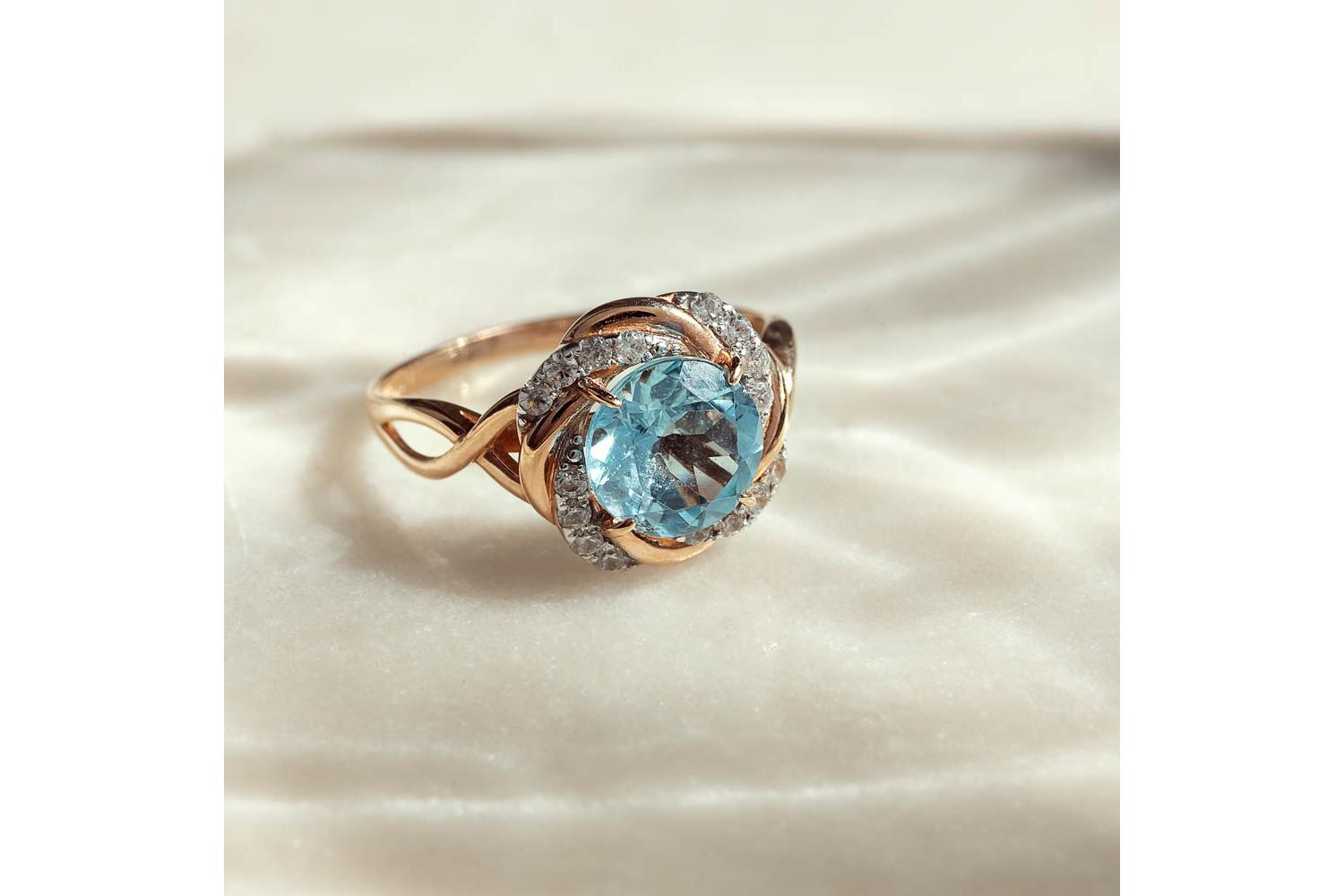 Мастера компании NEWGOLD, приложив всё свое мастерство и искусство, создали для Вас на нашем собственном производстве Кольцо из красного золота с топазом sky и 16 фианитами.