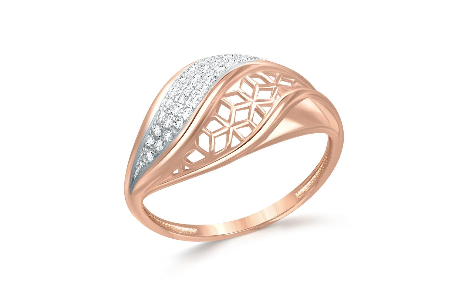 Изящное кольцо представляет собой истинный шедевр ювелирного искусства. Розово-золотистый металл переливается нежными оттенками, создавая впечатляющий контраст с серебристыми вкраплениями фианитов.