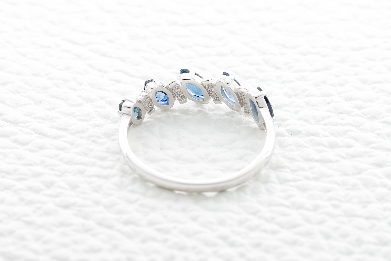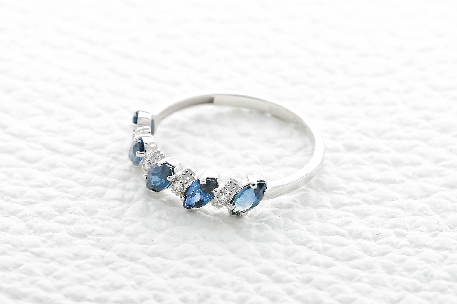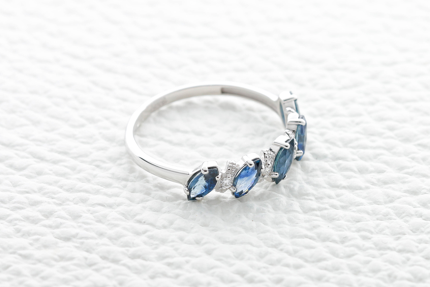 Сапфир натуральный, количество 5 шт., огранка маркиз, размер 5ˣ2,5, цвет 2, чистота 2, вес 0,77 карат. ; Бриллиант, количество 4 шт., огранка Кр-57, размер 1,25 мм, цвет 4, чистота 5, вес 0,037 карат.