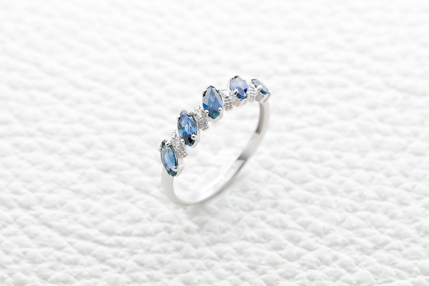 Сапфир натуральный, количество 5 шт., огранка маркиз, размер 5ˣ2,5, цвет 2, чистота 2, вес 0,878 карат. ; Бриллиант, количество 4 шт., огранка Кр-57, размер 1,25 мм, цвет 4, чистота 5, вес 0,031 карат.