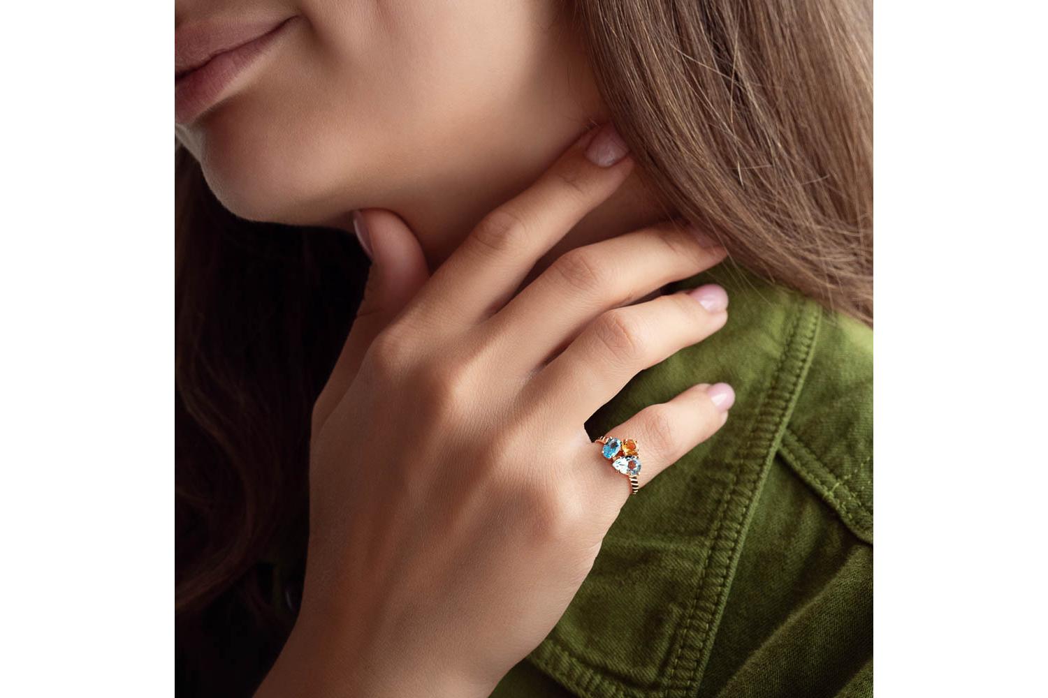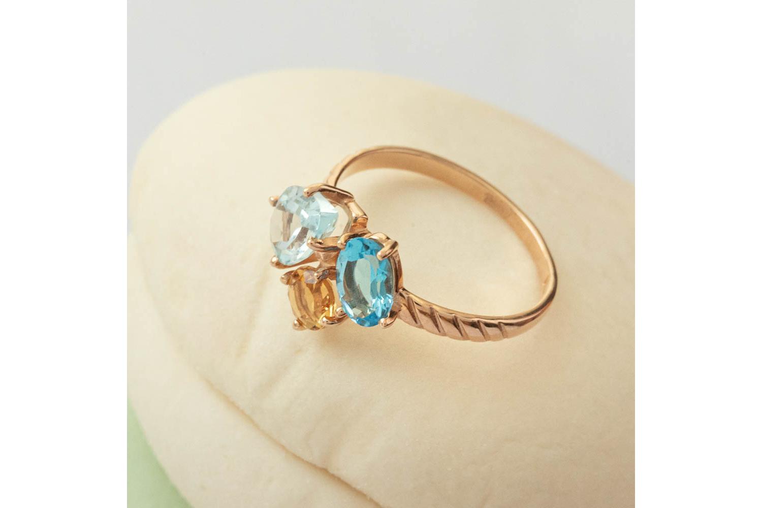 Мастера компании NEWGOLD, приложив всё свое мастерство и искусство, создали для Вас на нашем собственном производстве Кольцо из красного золота с топазом sky, топазом swiss и хризолитом.