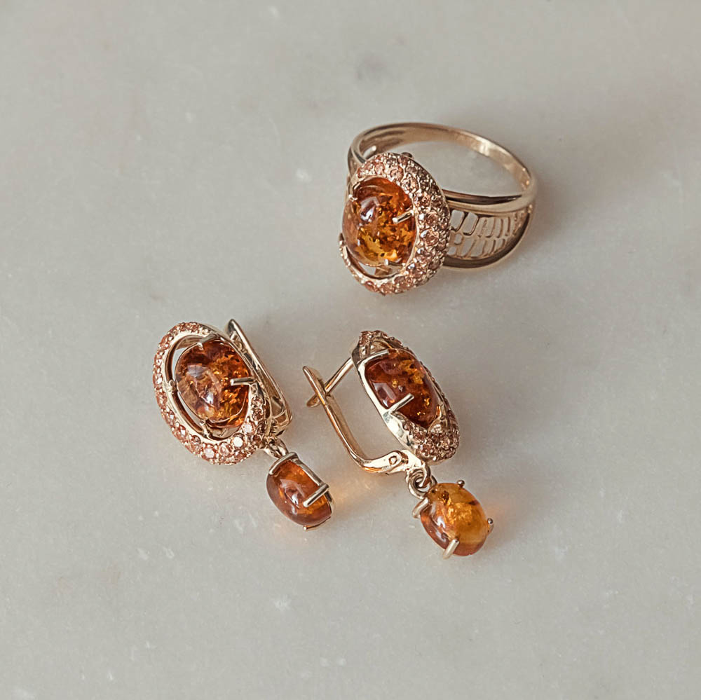 Янтарь натуральный, количество 1 шт., огранка овал-кабошон, размер 10ˣ8 ; Фианит коньячный, количество 5 шт., огранка круг, размер 2 мм ; Фианит коньячный, количество 5 шт., огранка круг, размер 1,75 мм ; Фианит коньячный, количество 6 шт., огранка кру