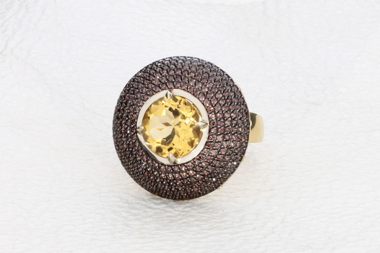 Цитрин натуральный, количество 1 шт., огранка круг, размер 10 мм ; Фианит коньячный, количество 292 шт., огранка круг, размер 1 мм