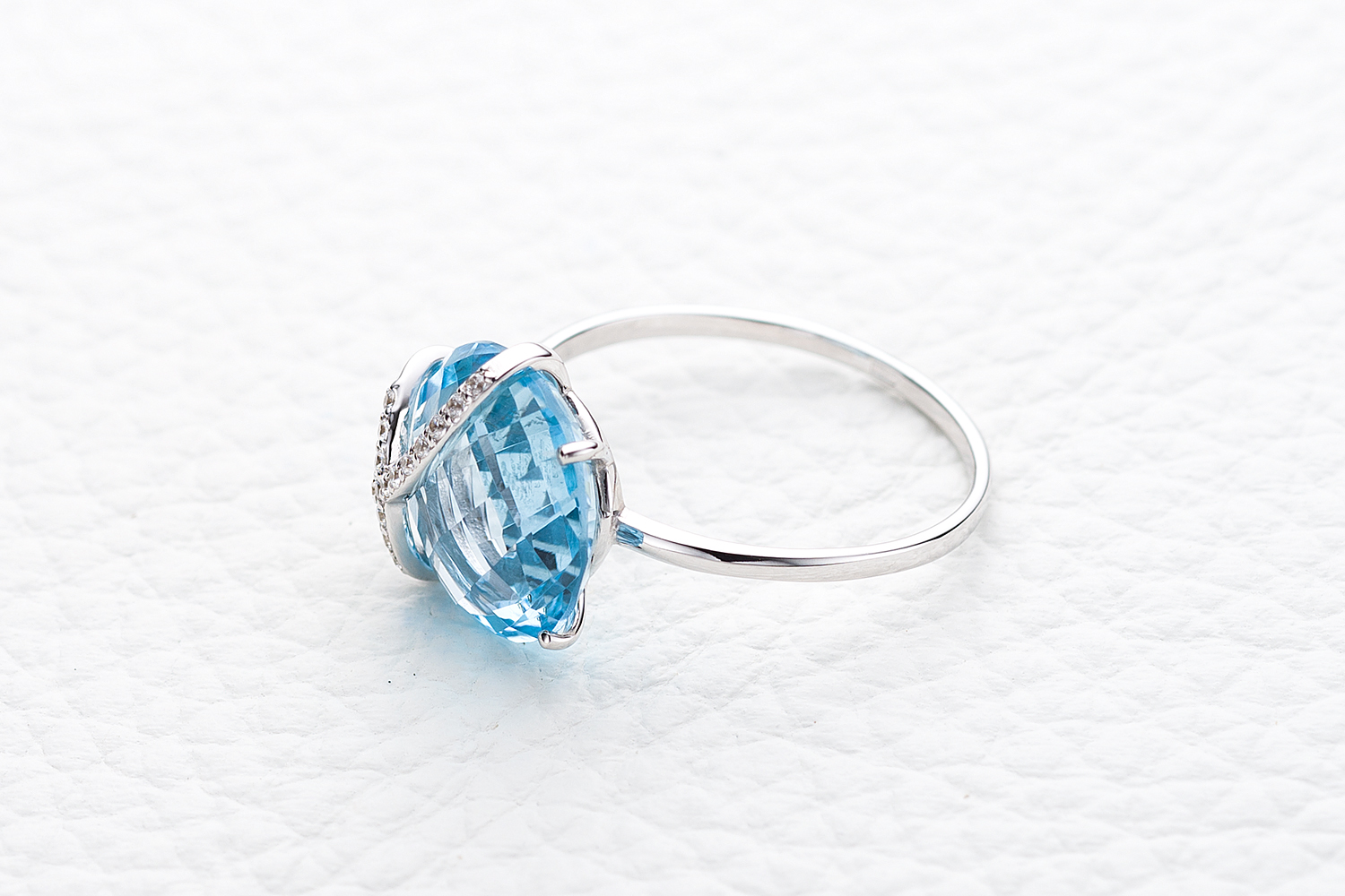 Мастера компании NEWGOLD, приложив всё свое мастерство и искусство, создали для Вас на нашем собственном производстве Кольцо из белого золота с топазом sky и 16 фианитами.
