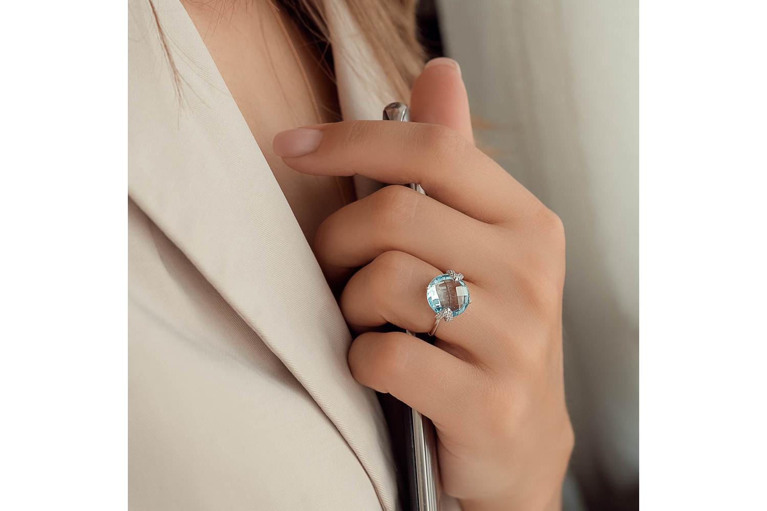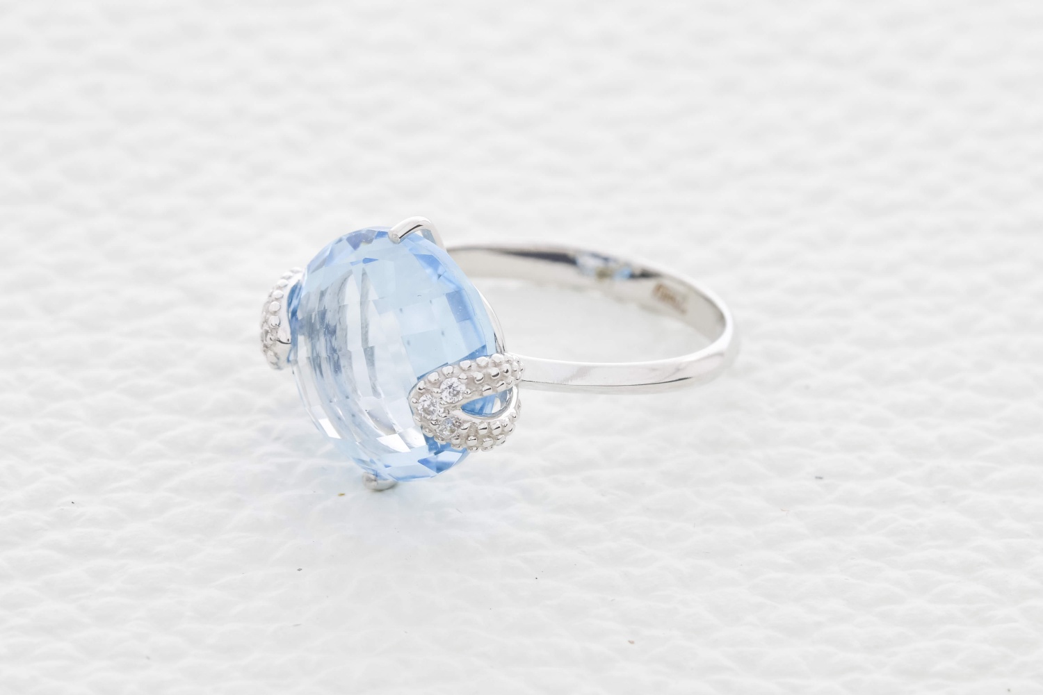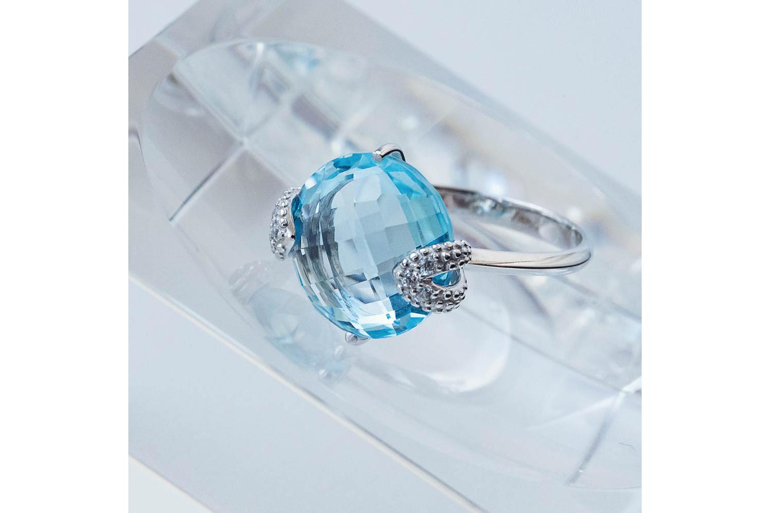 Мастера компании NEWGOLD, приложив всё свое мастерство и искусство, создали для Вас на нашем собственном производстве Кольцо из белого золота с топазом sky и 6 фианитами.