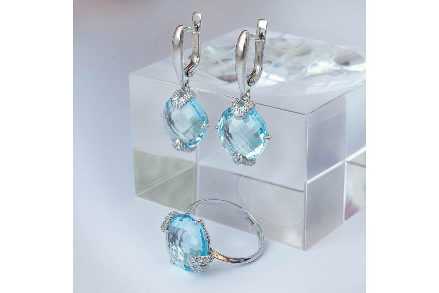 Топаз Sky натуральный, количество 1 шт., огранка круг-бриолет, размер 12 мм ; Фианит б/цв, количество 6 шт., огранка круг, размер 1,25 мм