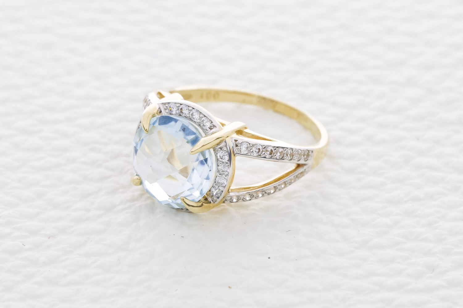 Мастера компании NEWGOLD, приложив всё свое мастерство и искусство, создали для Вас на нашем собственном производстве Кольцо из жёлтого золота с топазом sky и 44 фианитами.