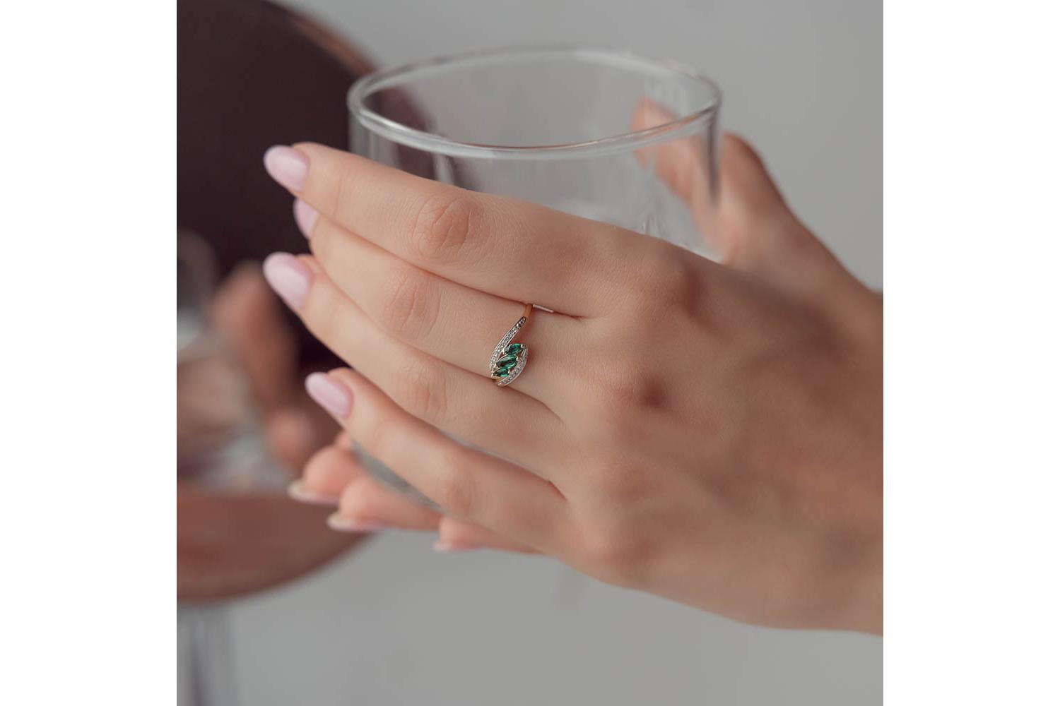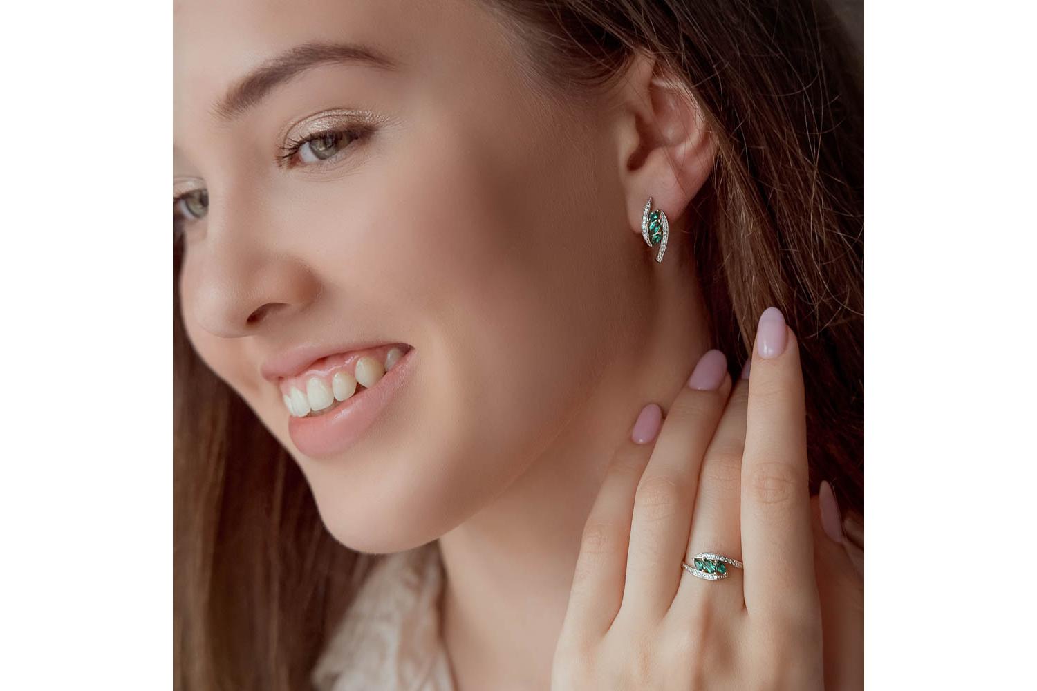 Изумруд Гт искусственный, количество 1 шт., огранка маркиз, размер 5ˣ2,5 ; Изумруд Гт искусственный, количество 2 шт., огранка маркиз, размер 4ˣ2 ; Бриллиант, количество 16 шт., огранка Кр-57, размер 1 мм, цвет 4, чистота 5, вес 0,083 карат.